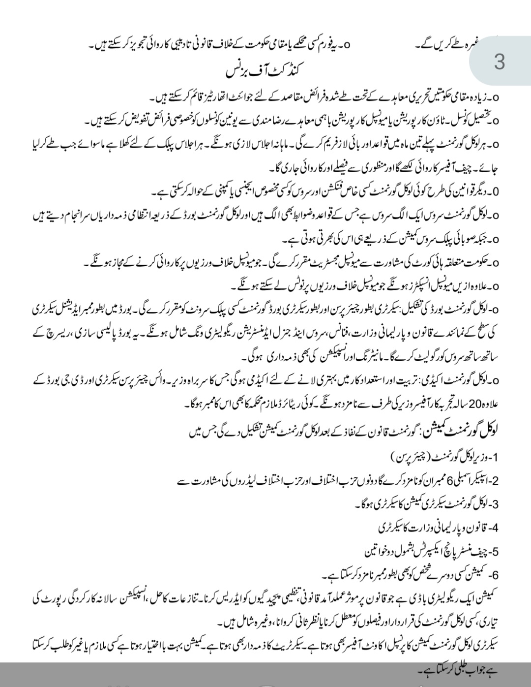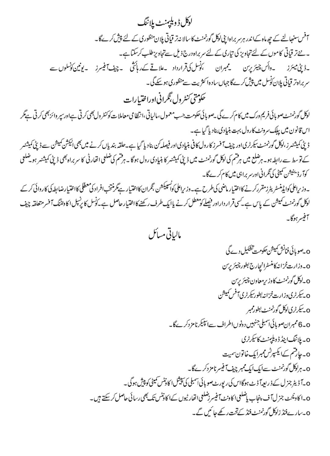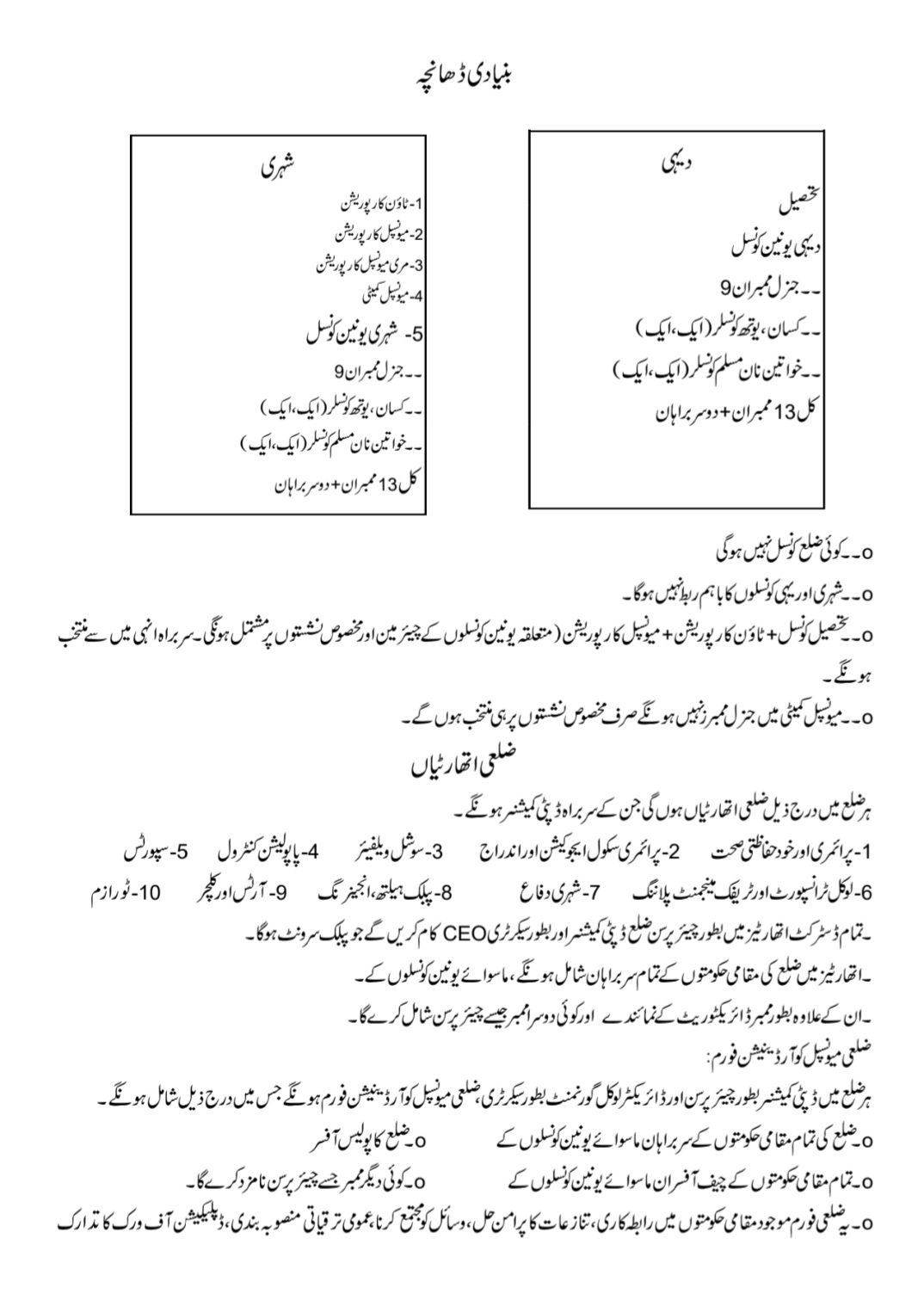 ۔ ۔ شیڈول ششم : لوکل گورنمنٹ اداروں کی جنرل پاور اور فنکشنز۔۔ شیڈول ہفتم: ایسے جرائم جن کی شنوائی عدالت میں ہوگی۔ – شیڈول ہشتم : عمومی جرائم اور خلاف ورزیاں ( قابل سزاء )۔ ۔ شیڈول نہم: جرمانوں کے ٹکٹ چیدہ چیدہ اہم نکات: لوکل گورنمنٹ کا دورانیہ پانچ سال ہوگا۔ ضلع بھر کی تمام لوکل گورنمنٹ اداروں کا با اختیار نگران / انچارج ضلع کا ڈپٹی کمیشنر ہوگا ( قانون میں واضع درج ہے )