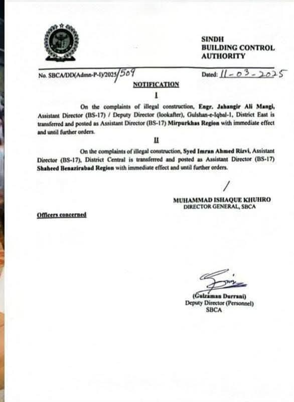 سندھ بلڈنگ کنٹرول اتھارٹی (SBCA) نے غیر قانونی تعمیرات کی شکایات پر دو افسران کے تبادلے کر دیئے ہیں۔ نوٹیفکیشن کے مطابق جہانگیر علی منگی (ڈپٹی ڈائریکٹر گلشن اقبال-1) کو میرپورخاص ریجن جبکہ سید عمران احمد رضوی (ڈسٹرکٹ سینٹرل) کو شہید بینظیر آباد ریجن ٹرانسفر کردیا گیا ہے یہ تبادلے فوری طور پر نافذ العمل ہوں گے۔