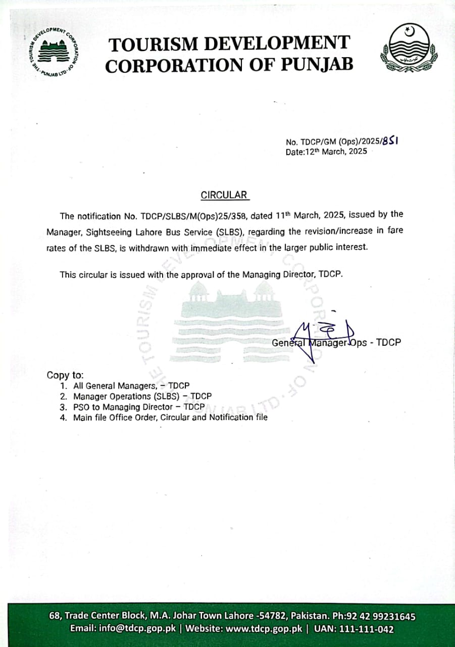 وزیراعلیٰ پنجاب مریم نوازشریف نے ٹی ڈی سی پی ڈبل ڈیکر بس کے کرایوں میں اضافہ مسترد کردیا۔وزیراعلیٰ مریم نوازشریف کے حکم پر کرایوں میں اضافے کا نوٹیفکیشن واپس لے لیاگیا۔ٹورازم ڈویلپمنٹ کارپوریشن پنجاب کی سائٹ سی ان لاہور بس سروس کے کرائے میں 200سے500روپے تک اضافہ کیاگیا تھا۔کارپوریٹ سیکٹر،تعلیمی اداروں،کمرشل ایکٹیویٹیز کیلئے کرایوں میں پانچ ہزار سے 20ہزار تک اضافہ تجویز کیاگیا تھا۔وزیراعلیٰ پنجاب مریم نوازشریف نے لاہور کی سیاحت کیلئے 3روٹ پر چلنے والی بس کے کرائے میں اضافے پر اظہار ناپسندیدگی کیا۔وزیراعلیٰ مریم نوازشریف نے متعلقہ ٹی ڈی سی پی حکام کو کرایوں میں اضافہ واپس لینے کی ہدایت کی ہے۔وزیراعلیٰ مریم نوازشریف کی ہدایت پر ٹی ڈی سی پی ڈبل ڈیکر بس کے پرانے کرائے بحال کردیئے گئے ہیں۔وزیراعلیٰ مریم نوازشریف نے کہاکہ ڈبل ڈیکر بس سروس عوام کی سیر و تفریح کیلئے شرو ع کی گئی ہے۔ڈبل ڈیکر بس کے کرایوں میں اضافے سے عوام پر بوجھ پڑے گا۔عوام کو سیر و سیاحت کی بہترین سہولتیں کم از کم چارجز پر مہیا کررہے ہیں اورکرتے رہیں گے۔