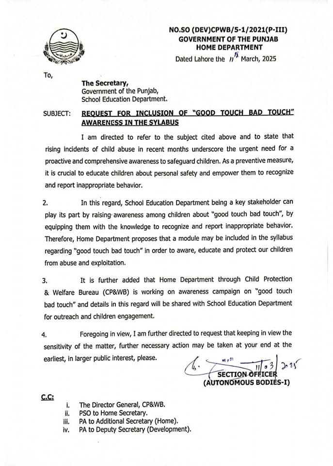 "گڈ ٹچ بیڈ ٹچ” بارے آگاہی بچوں کے نصاب میں شامل کرنے کی سفارش کردی ہے، محکمہ داخلہ پنجاب نے سکول ایجوکیشن ڈیپارٹمنٹ کے نام مراسلہ جاری کر دیا۔ درست تعلیم اور آگاہی کے بعد بچے نامناسب رویے کو پہچان کر رپورٹ کر سکتے ہیں۔ بچوں کو سکھایا جائے کہ جنسی استحصال کی کوشش کرنے والوں سے ڈرنا نہیں بلکہ انہیں بے نقاب کرنا ہے۔ محکمہ داخلہ چائلڈ پروٹیکشن بیورو کے ذریعے بھی "گڈ ٹچ بیڈ ٹچ” بارے آگاہی مہم تیار کر رہا ہے۔ معاملے کی حساسیت کے پیش نظر آنے والی نسلوں کو محفوظ بنانے کیلئے فوری حکمت عملی مرتب کی جائے!