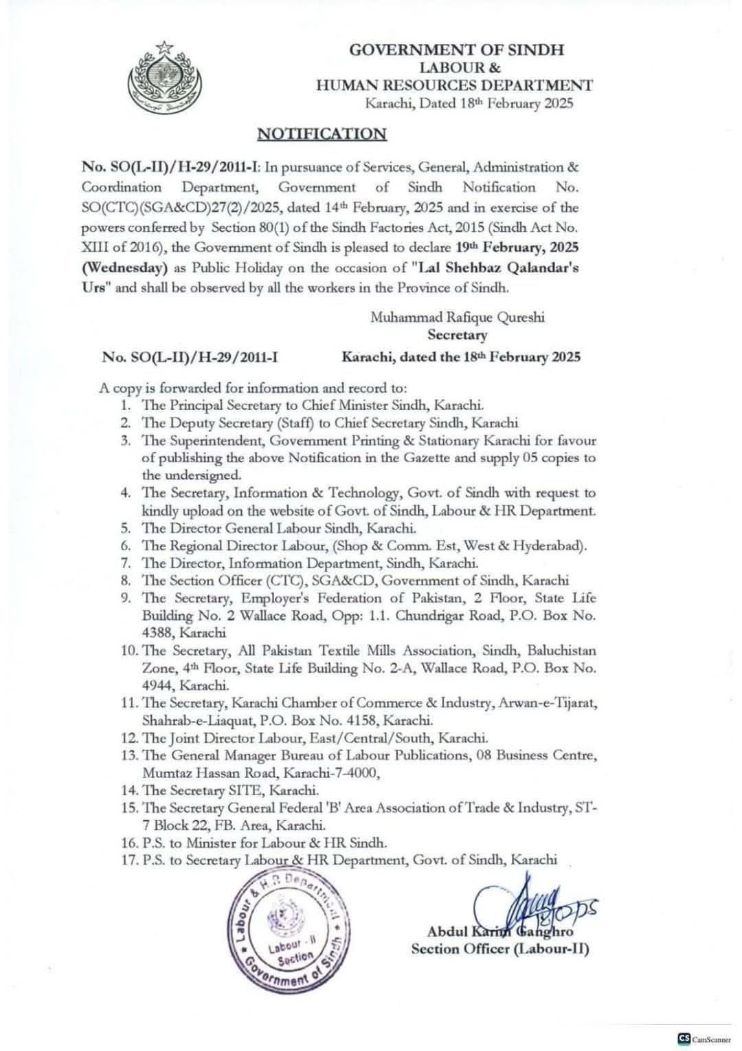 سندھ حکومت نے 19 فروری کو حضرت لعل شہباز قلندرؒ کے عرس پر عام تعطیل کا اعلان کر دیا ہے جس کہ بعد محکمہ لیبر نے بھی مزدوروں اور محنت کشوں کیلئے عام تعطیل کا اعلان کیا ہے۔