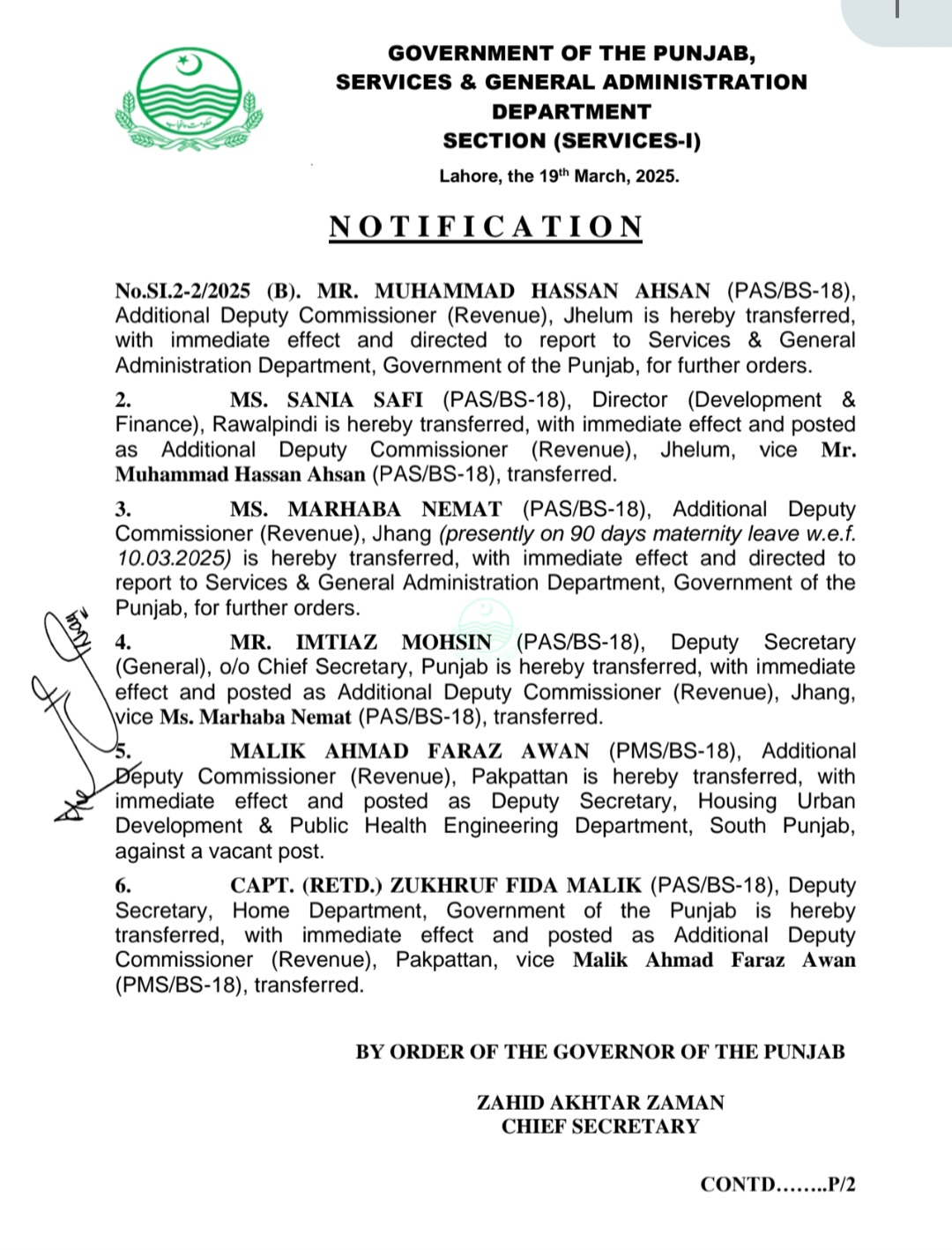 ڈائریکٹر ڈوپلپمنٹ اینڈ فنانس راولپنڈی ثانیہ صفی کو تبدیل کرکے ایڈیشنل ڈپٹی کمشنر ریونیو جہلم تعینات کردیا گیا ہے۔ایڈیشنل ڈپٹی کمشنر ریونیو جھنگ مرحبا نعمت کو 3 ماہ کی چھٹیوں کے باعث محکمہ سروسز رپورٹ کرنے کی ہدایت کی گئی ہے۔امتیاز محسن کو ایڈیشنل ڈپٹی کمشنر ریونیو جھنگ تعینات کردیا گیا ہے۔