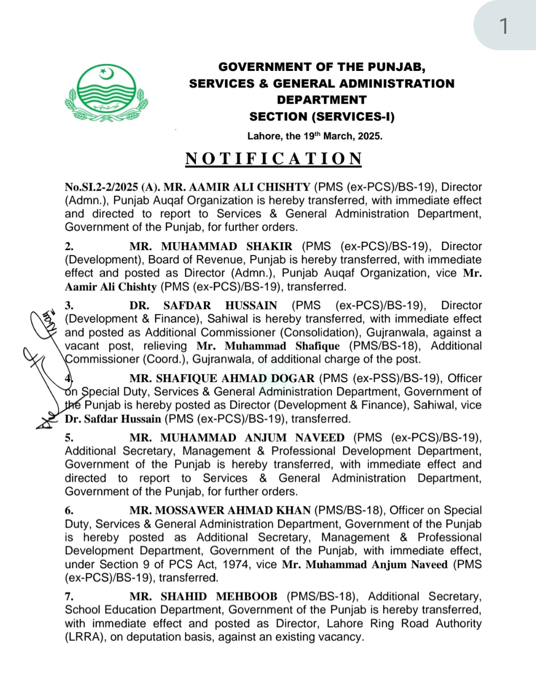 شفیق احمد ڈوگر کو ڈائریکٹر ڈوپلپمنٹ اینڈ فنانس ساہیوال تعینات کیا گیا ہے۔ایڈیشنل سیکرٹری محکمہ منیجمنٹ اینڈ پروفیشنل ڈوپلپمنٹ محمد انجم نوید کو محکمہ سروسز رپورٹ کرنے کی ہدایت کی گئی ہے۔مصور احمد خان کو ایڈیشنل سیکرٹری محکمہ منیجمنٹ اینڈ پروفیشنل ڈوپلپمنٹ تعینات کردیا گیا ہے۔ایڈیشنل سیکرٹری محکمہ سکول ایجوکیشن شاہد محبوب کو ڈائریکٹر لاہور رنگ روڈ اتھارٹی تعینات کردیا گیا ہے۔ڈائریکٹر اسٹیٹ پنجاب اوقاف آرگنائزیشن شبیر حسین چیمہ کو ایڈیشنل سیکرٹری پی سی بی ایل تعینات کردیا گیا ہے۔ایڈیشنل کمشنر کونسولیڈیشن بہاولپور منور حسین کو ایڈیشنل سیکرٹری محکمہ ہیلتھ جنوبی پنجاب تعینات کردیا گیا ہے۔