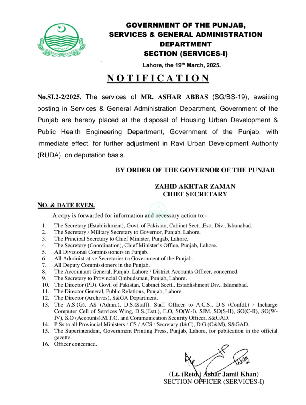 چیف سیکرٹری پنجاب زاہد اختر زمان نے تقرری کے منتظر گریڈ 19 کے آشر عباس کی خدمات محکمہ ہاؤسنگ کے سپرد کر دی ہیں جن کو راوی اربن ڈویلپمنٹ اتھارٹی میں اہم ذمہ داریاں دی جائیں گی۔