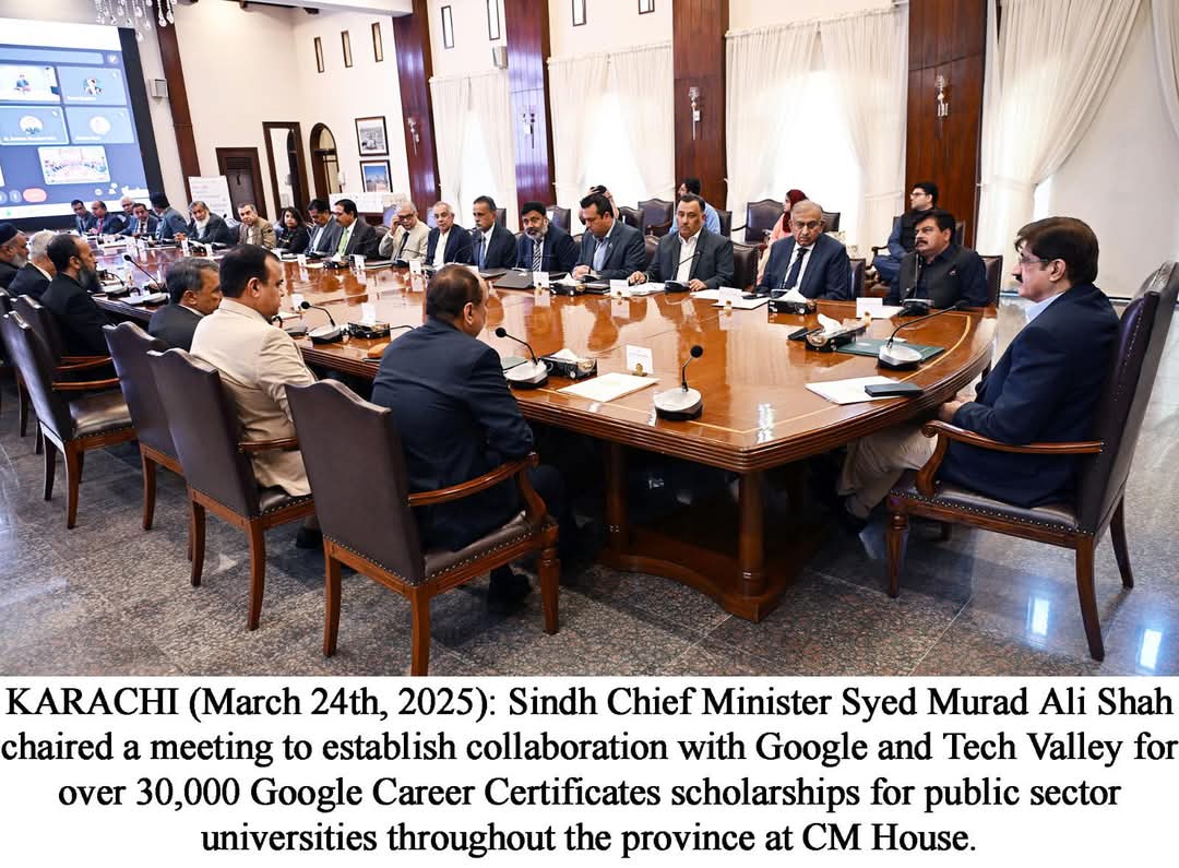کراچی (24 مارچ) نوجوانوں کو عالمی سطح پر تسلیم شدہ ڈیجیٹل مہارتوں سے آراستہ کرنے کے لیے سندھ حکومت نے گوگل اور ٹیک ویلی کے اشتراک سے صوبے کی سرکاری جامعات کے طلبہ کے لیے 30,000 سے زائد گوگل کیریئر سرٹیفکیٹس اسکالرشپس کا اعلان کیا ہے۔وزیر اعلیٰ سندھ سید مراد علی شاہ کی زیر صدارت پیر کے روز وزیر اعلیٰ ہاؤس میں ایک اجلاس منعقد ہوا جس میں اس اقدام کو باضابطہ بنانے کے لیے مفاہمتی یادداشت پر دستخط کیے گئے۔ اجلاس میں وزیر تعلیم سید سردار شاہ، سیکریٹری وزیر اعلیٰ رحیم شیخ، چیئرمین ایچ ای سی سندھ پروفیسر طارق رفیع، سیکریٹری اسکول ایجوکیشن زاہد عباسی، سیکریٹری آئی ٹی نور سموں، سیکریٹری یونیورسٹیز اینڈ بورڈز عباس بلوچ، 30 سرکاری جامعات کے وائس چانسلرز، ٹیک ویلی پاکستان کے سی ای او عمر فاروق اور دیگر متعلقہ افراد نے شرکت کی۔وزیر اعلیٰ نے کہا کہ اس اقدام کا مقصد طلبہ کو مصنوعی ذہانت، سائبر سیکیورٹی، ڈیجیٹل مارکیٹنگ، آئی ٹی آٹومیشن اور پروجیکٹ مینجمنٹ جیسے اہم شعبوں میں جدید ڈیجیٹل مہارتوں سے آراستہ کرنا ہے تاکہ وہ بدلتے ہوئے روزگار کے مواقع سے بہتر طور پر فائدہ اٹھا سکیں۔مراد علی شاہ نے کہا کہ 2024 گوگل کیریئر سرٹیفکیٹس سندھ پروگرام کی کامیابی کے بعد جس میں 10 جامعات کے 1,500 طلبہ نے 100 فیصد کامیابی حاصل کی۔ 2025 میں اس پروگرام کی توسیع سے حکومت کے ڈیجیٹل ترقی اور افرادی قوت کی بہتری کے عزم کی عکاسی ہوتی ہے۔مراد علی شاہ نے پروگرام کی اہمیت پر زور دیتے ہوئے کہا کہ یہ شراکت داری ہمارے اس وژن کی عکاسی کرتی ہے کہ سندھ کو جدت اور مہارتوں کے فروغ کا مرکز بنایا جائے۔ انہوں نے مزید کہا کہ 30,000 سے زائد اسکالرشپس کی فراہمی صرف تعلیم میں سرمایہ کاری نہیں بلکہ یہ ہمارے نوجوانوں کے مستقبل اور صوبے کی معاشی ترقی میں سرمایہ کاری ہے۔گوگل کے ماہرین کے تیار کردہ کیریئر سرٹیفکیٹس پروگرام کے تحت طلبہ کو لچکدار آن لائن تعلیمی سہولت فراہم کی جاتی ہے جس کے ذریعے وہ روایتی ڈگری کے بغیر بھی تین سے چھ ماہ میں متعلقہ صنعت سے متعلق تسلیم شدہ اسناد حاصل کر سکتے ہیں۔وزیر اعلیٰ مراد علی شاہ نے کامیابیوں اور کیریئر میں ترقی پر بات کرتے ہوئے کہا کہ گزشتہ بیچ کے فارغ التحصیل طلبہ نے معروف کمپنیوں میں ملازمتیں اور انٹرن شپس حاصل کیں جہاں ان کی تنخواہیں 70,000 روپے سے 16 لاکھ روپے ماہانہ تک تھیں۔ انہوں نے مثال دیتے ہوئے کہا کہ ایسی ہی ایک کامیاب کہانی لیلا کماری کی ہے جو یونیورسٹی آف سندھ جامشورو کی طالبہ ہیں۔ انہوں نے گوگل کا مصنوعی ذہانت کا کورس مکمل کیا اور ایوولوشن میں ایک پروجیکٹ انٹرن شپ حاصل کی۔ وزیر اعلیٰ نے مزید کہا کہ گوگل نے ان کی کہانی نمایاں کی جو اس اقدام کے حقیقی اثرات کو ظاہر کرتی ہے۔گوگل کے گورنمنٹ افیئرز اینڈ پبلک پالیسی لیڈ کائل گارڈنر نے اس اقدام کی اہمیت پر روشنی ڈالتے ہوئے کہا کہ گوگل اس بات کا عزم رکھتا ہے کہ افراد کو وہ ڈیجیٹل مہارتیں فراہم کی جائیں جو آج کی معیشت میں کامیابی کے لیے ضروری ہیں۔ اس شراکت داری کے ذریعے سندھ بھر کے طلبہ کو عالمی معیار کی تربیت تک رسائی حاصل ہوگی جو نہ صرف ان کے کیریئر کے نئے مواقع کھولے گی بلکہ معاشی ترقی کو بھی فروغ دے گی۔سیکریٹری آئی ٹی نور سموں نے وزیر اعلیٰ کو بریفنگ دیتے ہوئے بتایا کہ 2025 کا پروگرام شمولیت اور رسائی کو فروغ دینے کے لیے تیار کیا گیا ہے جس کے تحت کم از کم 30 فیصد شرکاء خواتین ہوں گی تاکہ صنفی مساوات کو یقینی بنایا جا سکے۔ انہوں نے مزید کہا کہ یہ اقدام پسماندہ اور کم وسائل والے طبقوں تک پہنچنے پر بھی توجہ دے گا تاکہ سب کو یکساں تعلیمی مواقع فراہم کیے جا سکیں۔ اس پروگرام کو مزید وسعت دینے کے لیے سندھ کی 30 سرکاری جامعات کے ساتھ شراکت داری کی جائے گی۔ شرکاء کو نو خصوصی کورسز میں تربیت دی جائے گی جن میں مصنوعی ذہانت کے علاوہ دو نئے کورسزپرامپٹنگ اور ایجائل بھی شامل ہوں گے۔وزیر اعلیٰ نے کہا کہ گزشتہ سال متعارف کرایا گیا سافٹ اسکلز اینڈ کیریئر کامیابی سندھ پروگرام بھی جاری رہے گا جس کے