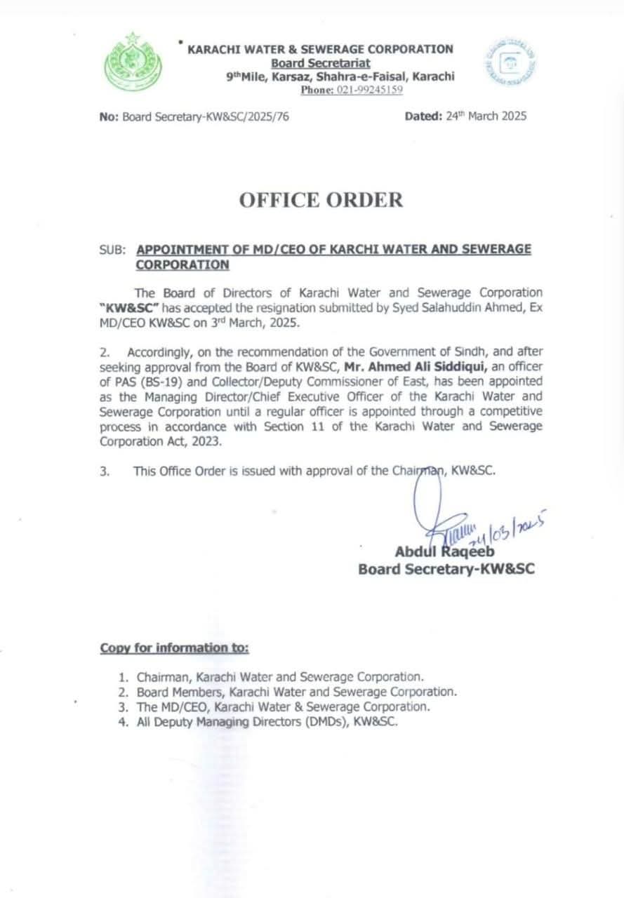 احمد علی صدیقی ڈپٹی کمشنر ایسٹ کوکراچی واٹر اینڈ سیوریج کارپوریشن کا منیجنگ ڈائریکٹر/چیف ایگزیکٹو آفیسر مقرر کر دیا گیا ہے۔