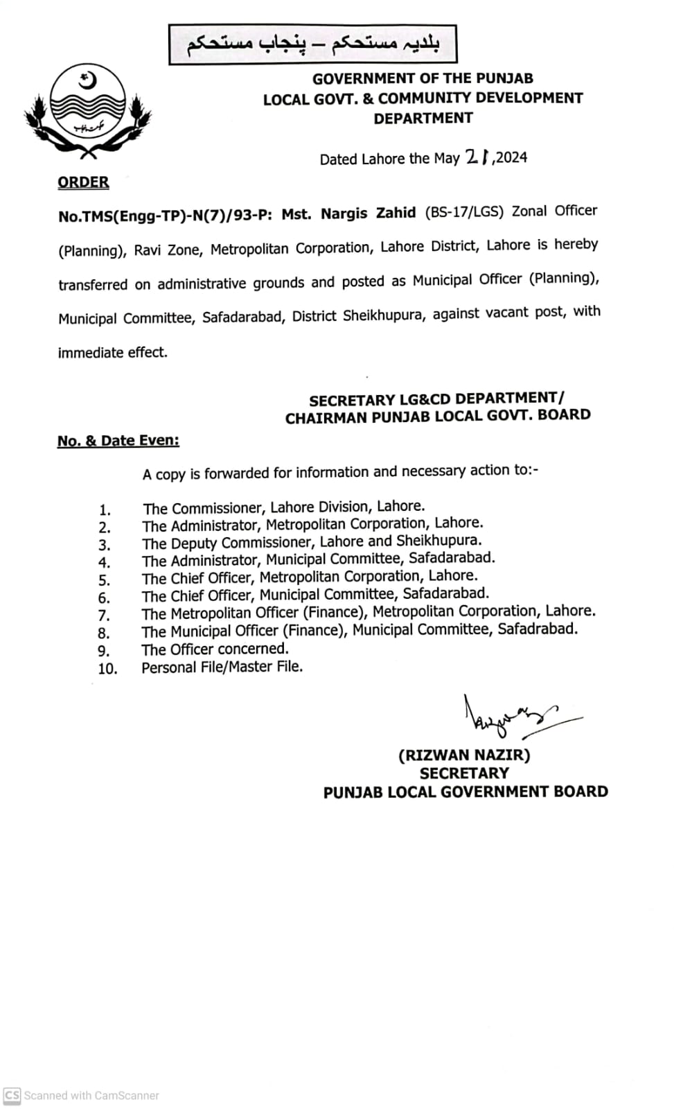 محکمہ بلدیات پنجاب نے لوکل گورنمنٹ سروس ٹاؤن پلاننگ ونگ کی تین خاتون افسران کے تقرروتبادلے کے احکامات جاری کر دیئے ہیں۔میٹروپولیٹن کارپوریشن لاہور داتا گنج بخش زون سے گریڈ18 کی زونل آفیسر پلاننگ مہوش نعیم کو انتظامی بنیادوں پر میونسپل آفیسر پلاننگ میونسپل کمیٹی چونیاں تعینات کر دیا گیا ہے۔عائشہ بشری میونسپل آفیسر پلاننگ پتوکی سے چونیاں کا اضافی چارج واپس لے لیا گیا ہے۔ایم سی ایل کے راوی زون میں تعینات زونل آفیسر پلاننگ نرگس زاہد کو تبدیل کر دیا گیا ہے انھیں میونسپل آفیسر پلاننگ میونسپل کمیٹی صفدر آباد لگا دیا گیا ہے۔