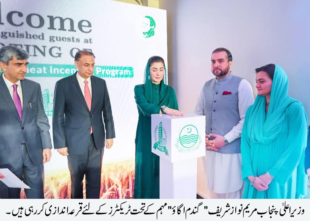 وزیراعلیٰ مریم نوازشریف نے”وزیراعلیٰ پنجاب وِیٹ این سینٹیو پروگرام“ کے تحت گندم کے کاشتکاروں کے لئے ایک ہزار مفت ٹریکٹر سکیم کی قرعہ اندازی کرکے باقاعدہ آغاز کر دیا۔ وزیر اعلیٰ مریم نوازشریف نے کاشتکاروں کے لئے مفت ٹریکٹرپروگرام کابٹن دبا کر ”گندم اگاؤ“ انعامی سکیم کے لئے ڈیجیٹل قرعہ اندازی کی۔ گندم اگاؤ مہم میں سب سے پہلا ٹریکٹر بہاولنگر کی خاتون کاشتکار کوثر پروین کا نکلا۔ وزیراعلیٰ مریم نوازشریف خود فون کرکے کامیاب کاشتکاروں کو مفت ٹریکٹرملنے کی مبارکباد دی۔ وزیراعلیٰ مریم نوازشریف نے جھنگ کے محمد اقبال کو بھی خود فون کرکے ڈیجیٹل قرعہ اندازی کے تحت مفت ٹریکٹر نکلنے پرمبارکباد دی جس پر کاشتکار نے وزیراعلیٰ مریم نوازشریف کا خود فون کرنے پر شکریہ ادا کیا۔ وزیراعلیٰ مریم نوازشریف نے منڈی بہاؤالدین کے کامیاب کاشتکار سلمان احمد سے فون کرکے بتایا کہ گندم اگاؤ قرعہ اندازی میں آپ کا مفت ٹریکٹر نکلا ہے جس پر سوچا کہ آپ کو خود مبارکباد دوں۔ پنجاب کے کاشتکار کے لئے گرین، ٹریکٹر، کسان کارڈ، سپر سیڈر سمیت بیشمار پراجیکٹس لانچ کیے ہیں۔ انہوں نے کہا کہ گندم کی فصل ان شا ء اللہ اچھی ہوگی میری عائیں کاشتکار بھائیوں کے ساتھ ہیں۔ وزیراعلیٰ مریم نوزشریف کوبریفنگ میں بتایاگیا کہ”گندم اگاؤ“ مہم میں مفت ٹریکٹرسکیم کے لئے ساڑھے 12 ایکڑ سے57733زائد اراضی مالک کاشتکاروں نے اپلائی کیا۔ جانچ پڑتال کے بعد 21496 کاشتکار قرعہ اندازی کے لئے اہل قرار پائے۔ قرعہ اندازی میں کامیاب ایک ہزار کاشت کاروں کو 55 ہارس پاور کے ٹریکٹر مفت دئیے جائیں گے۔ تین ماہ کے اندر تمام کاشتکاروں کو ٹریکٹر کی فراہمی شروع ہو جائے گی۔بریفنگ میں مزید بتایا گیا کہ پنجاب میں 5لاکھ60ہزار ایکٹر اراضی پر گندم کاشت کی گئی۔