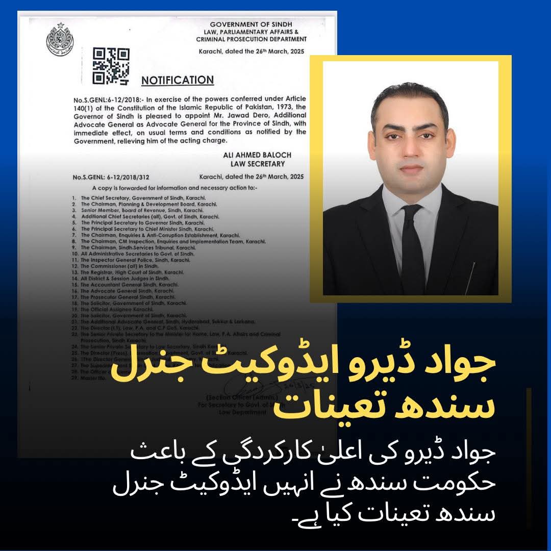 جواد ڈیرو کی اعلیٰ کارکردگی کے باعث حکومت سندھ نے انہیں ایڈوکیٹ جنرل سندھ تعینات کیا ہے۔
