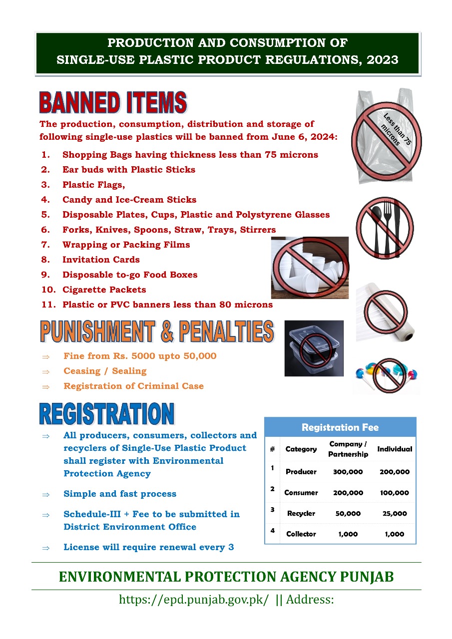 6 جون 2024 سے درج ذیل سنگل استعمال پلاسٹک کی پیداوار، استعمال، تقسیم اور ذخیرہ کرنے پر پابندی عائد کر دی جائے گی۔
