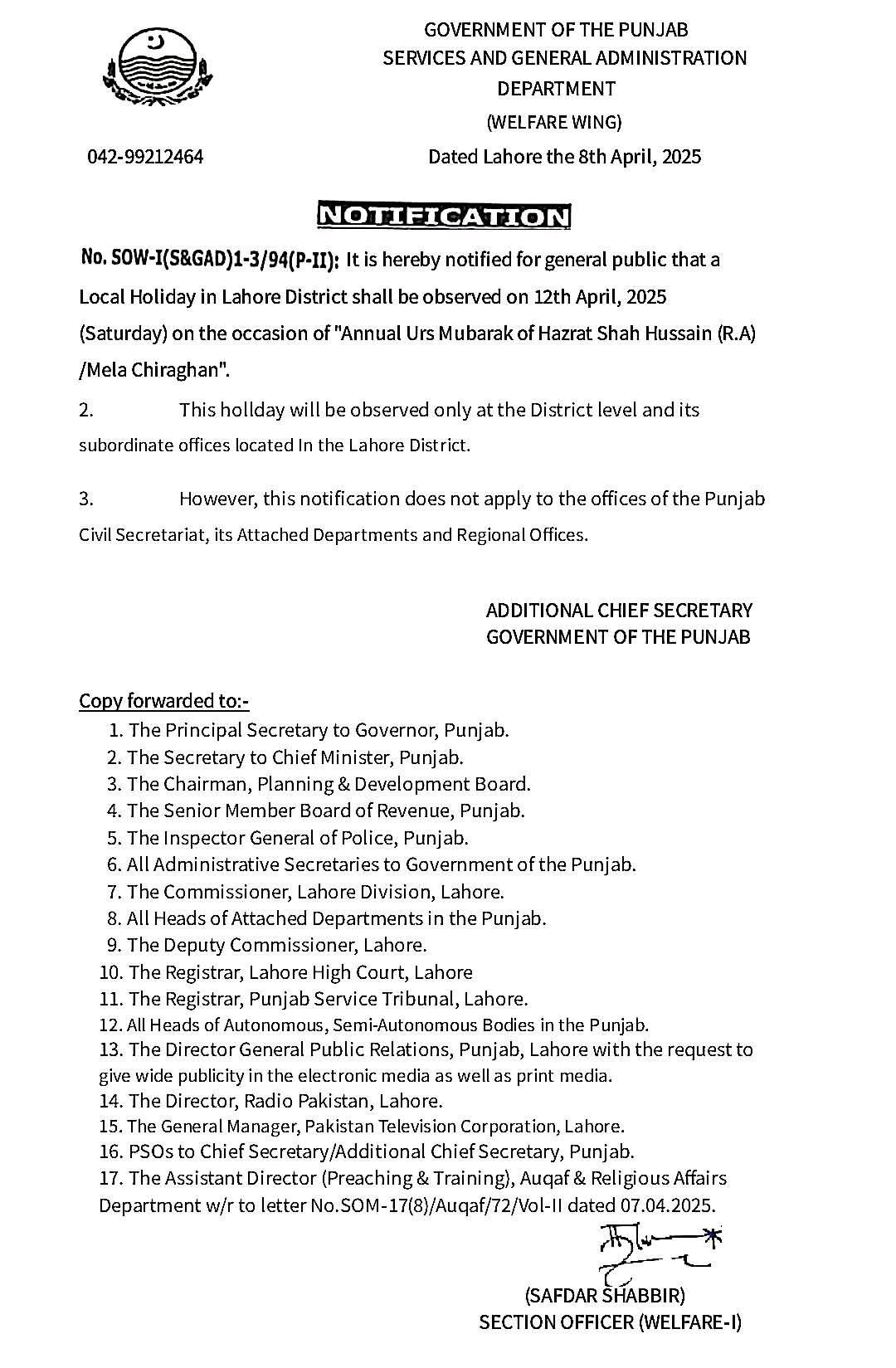 میلا چراغاں کے موقع پر 12 اپریل بروز ہفتہ ضلع لاہور میں عام تعطیل ہوگی۔اس سلسلہ میں حکومت پنجاب نےنوٹیفیکیشن جاری کر دیا ہے۔