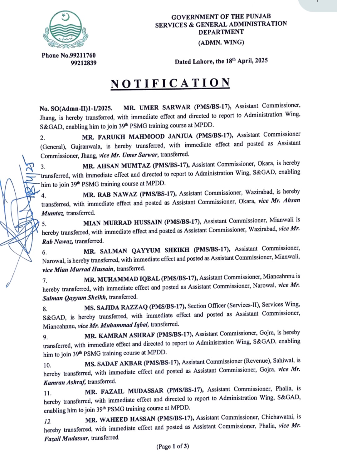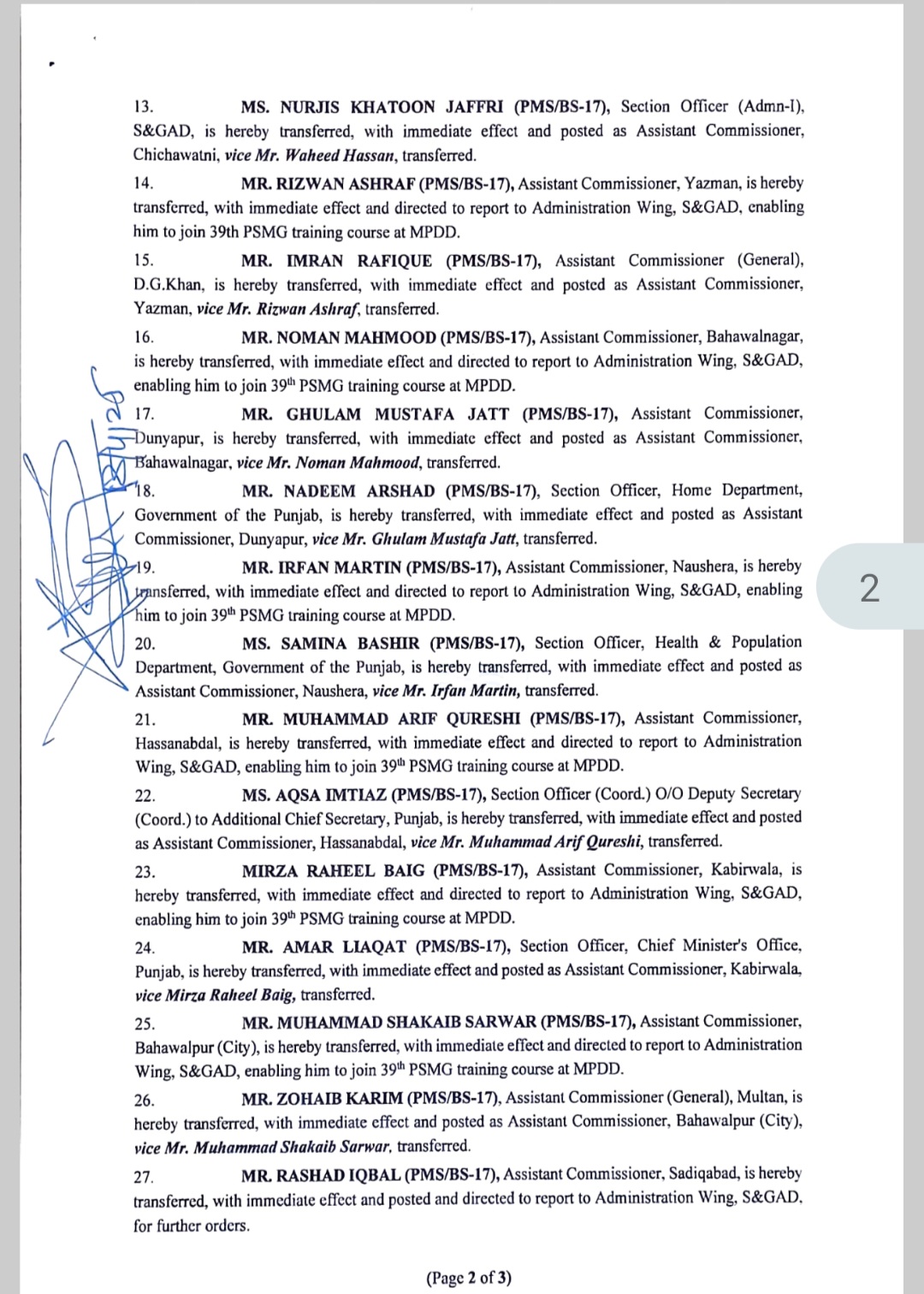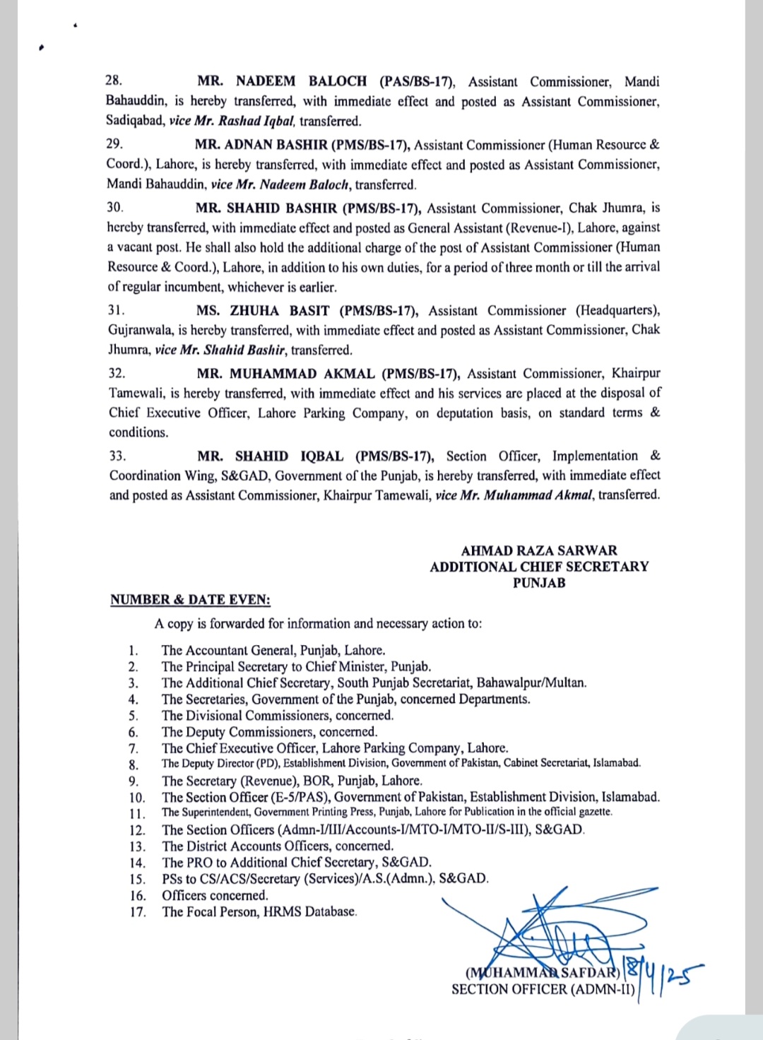 نرجس خاتون جعفری کو اسسٹنٹ کمشنر چیچہ وطنی تعینات کردیا گیا ہے۔اسسٹنٹ کمشنر یزمان منڈی رضوان اشرف کو کورس کے سلسلہ میں محکمہ سروسز رپورٹ کرنے کی ہدایت کی گئی ہے۔اسسٹنٹ کمشنر جنرل ڈیرہ غازی خان عمران رفیق کو اسسٹنٹ کمشنر یزمان منڈی تعینات کردیا گیا ہے۔اسسٹنٹ کمشنر بہاولنگر نعمان محمود کو کورس کے سلسلہ میں محکمہ سروسز رپورٹ کرنے کی ہدایت کی گئی ہے۔اسسٹنٹ کمشنر دنیا پور غلام مصطفی جٹ کو اسسٹنٹ کمشنر بہاولنگر تعینات کردیا گیا ہے۔ندیم ارشد کو اسسٹنٹ کمشنر دنیا پور تعینات کردیا گیا ہے۔اسسٹنٹ کمشنر نوشہرہ عرفان مارتن کو کورس کے سلسلہ میں محکمہ سروسز رپورٹ کرنے کی ہدایت کی گئی ہے۔ثمینہ بشیر کو اسسٹنٹ کمشنر نوشہرہ تعینات کردیا گیا ہے۔اسسٹنٹ کمشنر حسن ابدال محمد عارف قریشی کو کورس کے سلسلہ میں محکمہ سروسز رپورٹ کرنے کی ہدایت کی گئی ہے۔اقصی امتیاز کو اسسٹنٹ کمشنر حسن ابدال تعینات کردیا گیا ہے۔اسسٹنٹ کمشنر کبیروالا مرزا راحیل بیگ کو کورس کے سلسلہ میں محکمہ سروسز رپورٹ کرنے کی ہدایت کی گئی ہے۔عامر لیاقت کو اسسٹنٹ کمشنر کبیروالا تعینات کردیا گیا ہے۔اسسٹنٹ کمشنر بہاولپور سٹی محمد شکیب سرور کو کورس کے سلسلہ میں محکمہ سروسز رپورٹ کرنے کی ہدایت کی گئی ہے۔اسسٹنٹ کمشنر جنرل ملتان زوہیب کریم کو اسسٹنٹ کمشنر سٹی بہاولپور تعینات کردیا گیا ہے۔اسسٹنٹ کمشنر صادق آباد راشد اقبال کو محکمہ سروسز رپورٹ کرنے کی ہدایت گئی ہے۔اسسٹنٹ کمشنر منڈی بہاؤالدین ندیم بلوچ کو اسسٹنٹ کمشنر صادق آباد تعینات کردیا گیا ہے۔اسسٹنٹ کمشنر ہیومن ریسورس لاہور عدنان بشیر کو اسسٹنٹ کمشنر منڈی بہاؤالدین تعینات کردیا گیا ہے۔اسسٹنٹ کمشنر چک جھمرہ شاہد بشیر کو جنرل اسسٹنٹ ریونیو لاہور تعینات کردیا گیا ہےاور اسسٹنٹ کمشنر ہیومن ریسورس لاہور کا اضافی چارج سونپ دیا گیا ہے۔اسسٹنٹ کمشنر ہیڈکوارٹر گوجرانوالہ ظحی باسط کو اسسٹنٹ کمشنر چک جھمرہ تعینات کردیا گیا ہے۔اسسٹنٹ کمشنر خیر پور ٹامیونوالی محمد اکمل کی خدمات سی ای او لاہور پارکنگ کمپنی کے سپرد،شاہد اقبال کو اسسٹنٹ کمشنر خیر پور ٹامیونوالی تعینات کردیا گیا ہے۔