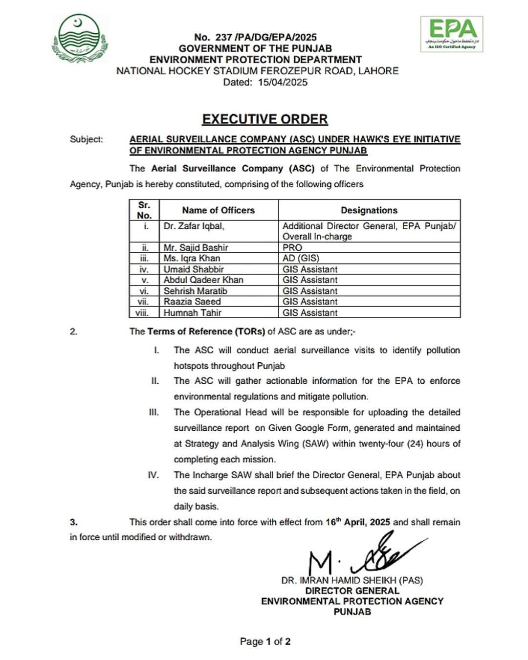 ادارہ تحفظ ماحول، پنجاب کا بڑا اقدام۔ "ہاک آئی” پروجیکٹ کے تحت ایریل سرویلنس کمپنی (ASC) قائم کر دی گئی۔ یہ کمپنی پنجاب بھر میں آلودگی کے ہاٹ اسپاٹس کی نشاندہی کرے گی