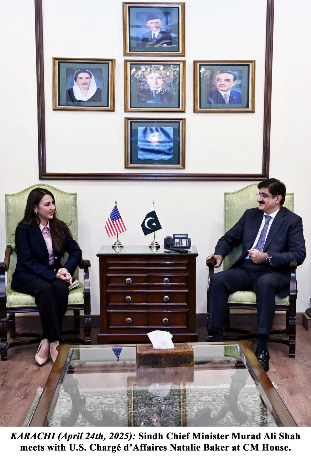 وزیراعلیٰ سندھ سید مراد علی شاہ سے امریکی ناظم الامور نٹالی بیکر نے ملاقات کی جس میں امریکا اور حکومتِ سندھ کے درمیان باہمی تعاون پر تبادلہ خیال کیا گیا خصوصاً موسمیاتی تبدیلی اور اس کے اثرات پر زور دیا گیا۔یہ ملاقات وزیراعلیٰ ہاؤس میں ہوئی جس میں امریکی قونصل جنرل اسکاٹ اوبیرم، چیف سیکریٹری سندھ آصف حیدر شاہ، پرنسپل سیکریٹری آغا واصف اور دیگر اعلیٰ حکام شریک ہوئے۔وزیراعلیٰ سندھ مراد علی شاہ اور نٹالی بیکر نے زرعی ترقی اور جدید کاشتکاری ٹیکنالوجیز کے استعمال سمیت مختلف دوطرفہ امور پر خیالات کا تبادلہ کیا۔ دونوں نے تعلیم، صحت کے شعبوں اور سرمایہ کاری میں تعاون پر بھی غور کیا اور ماحولیاتی چیلنجز سے نمٹنے کے لیے مشترکہ اقدامات کی ضرورت پر زور دیا۔سیلاب متاثرہ کمیونٹیز کی بحالی اور گھروں کی تعمیر نو پر بھی بات چیت کی گئی۔ مراد علی شاہ نے بتایا کہ ان کی حکومت سیلاب متاثرین کے لیے 21 لاکھ گھر تعمیر کر رہی ہے اور ان کو مالکانہ حقوق دے دیے گئے ہیں۔نٹالی بیکر نے سندھ حکومت کی ترقیاتی کوششوں پر اطمینان کا اظہار کیا اور امریکا کی جانب سے جاری تعاون اور حمایت کی یقین دہانی کرائی۔ مراد علی شاہ نے امریکی حکومت کا شکریہ ادا کیا اور دوطرفہ تعلقات کو مزید مضبوط بنانے کے عزم کا اعادہ کیا۔ملاقات خوشگوار ماحول میں ہوئی جس میں دونوں فریقین نے باہمی تعلقات کو مزید فروغ دینے پر اتفاق کیا۔
