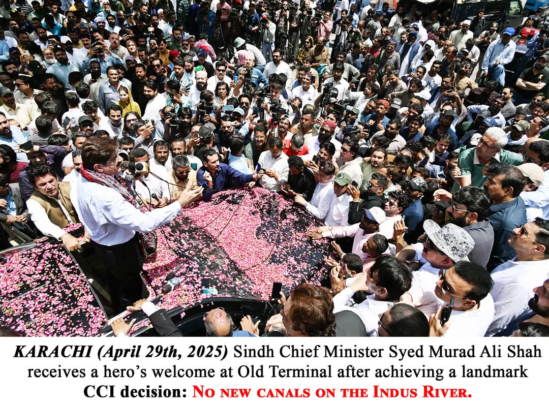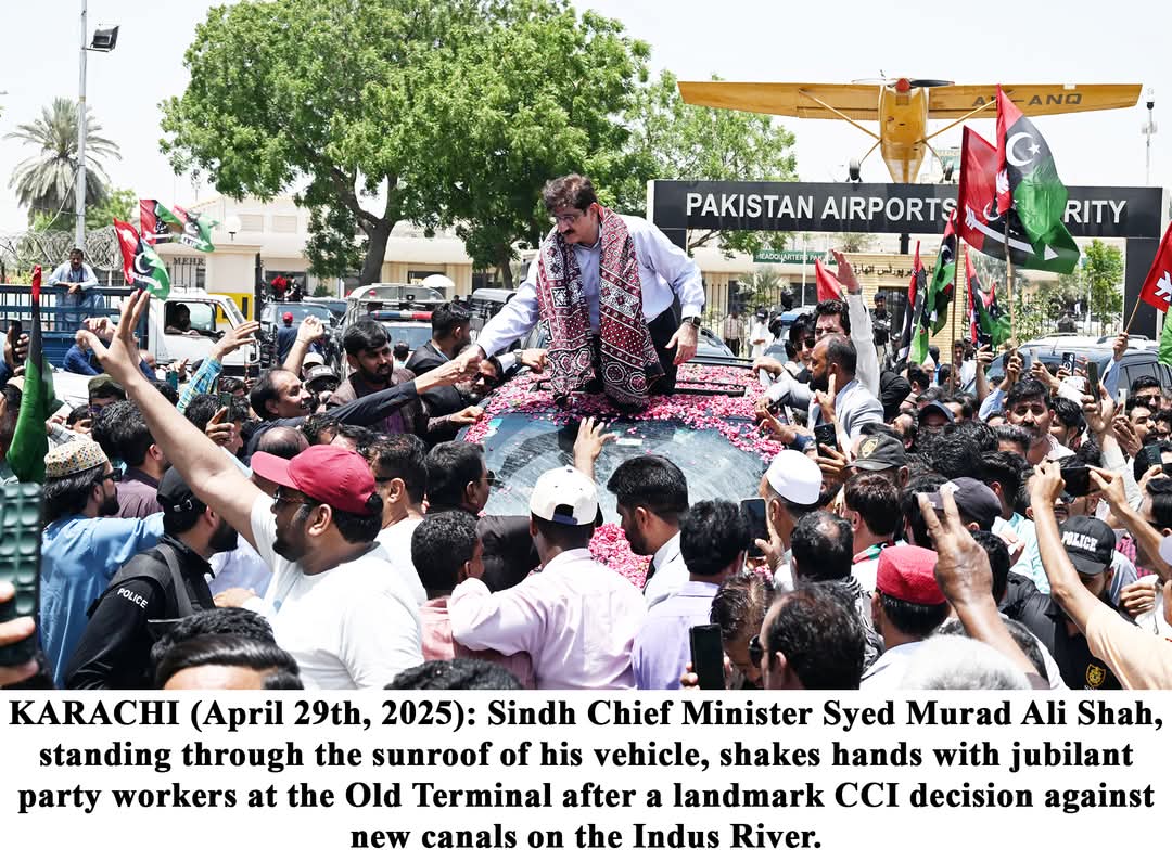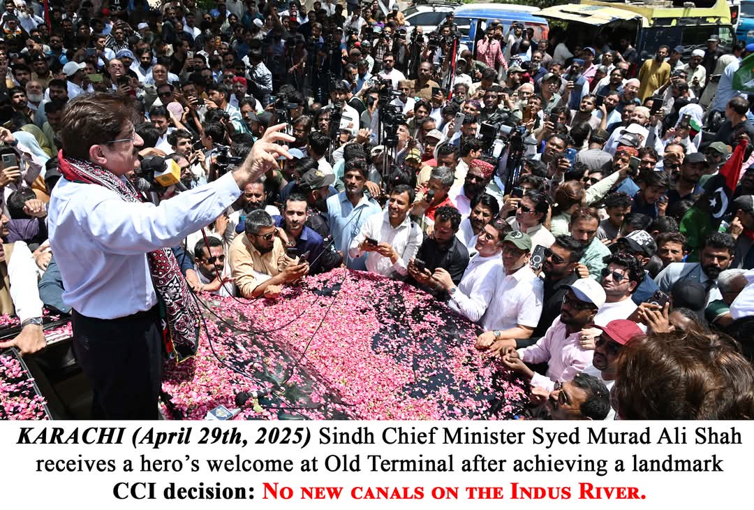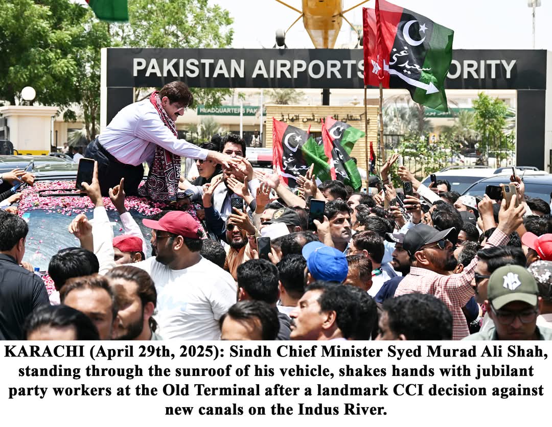 کراچی (29 اپریل) سندھ کے وزیر اعلیٰ مراد علی شاہ کی چولستان کینال کیخلاف سی سی آئی اجلاس میں تاریخی کامیابی کا اولڈ ٹرمینل پرجھومتے جیالوں کا جشن ، وزیراعلیٰ سندھ کا والہانہ استقبال کیا گیا، پارٹی کارکنان سے خطاب کرتے ہوئے مراد علی شاہ نے متنازعہ چولستان کینال منصوبے کی منسوخی کو سندھ کی ایک تاریخی فتح اور آئینی انصاف کی کامیابی قرار دیا۔ انہوں نے واضح کیا کہ