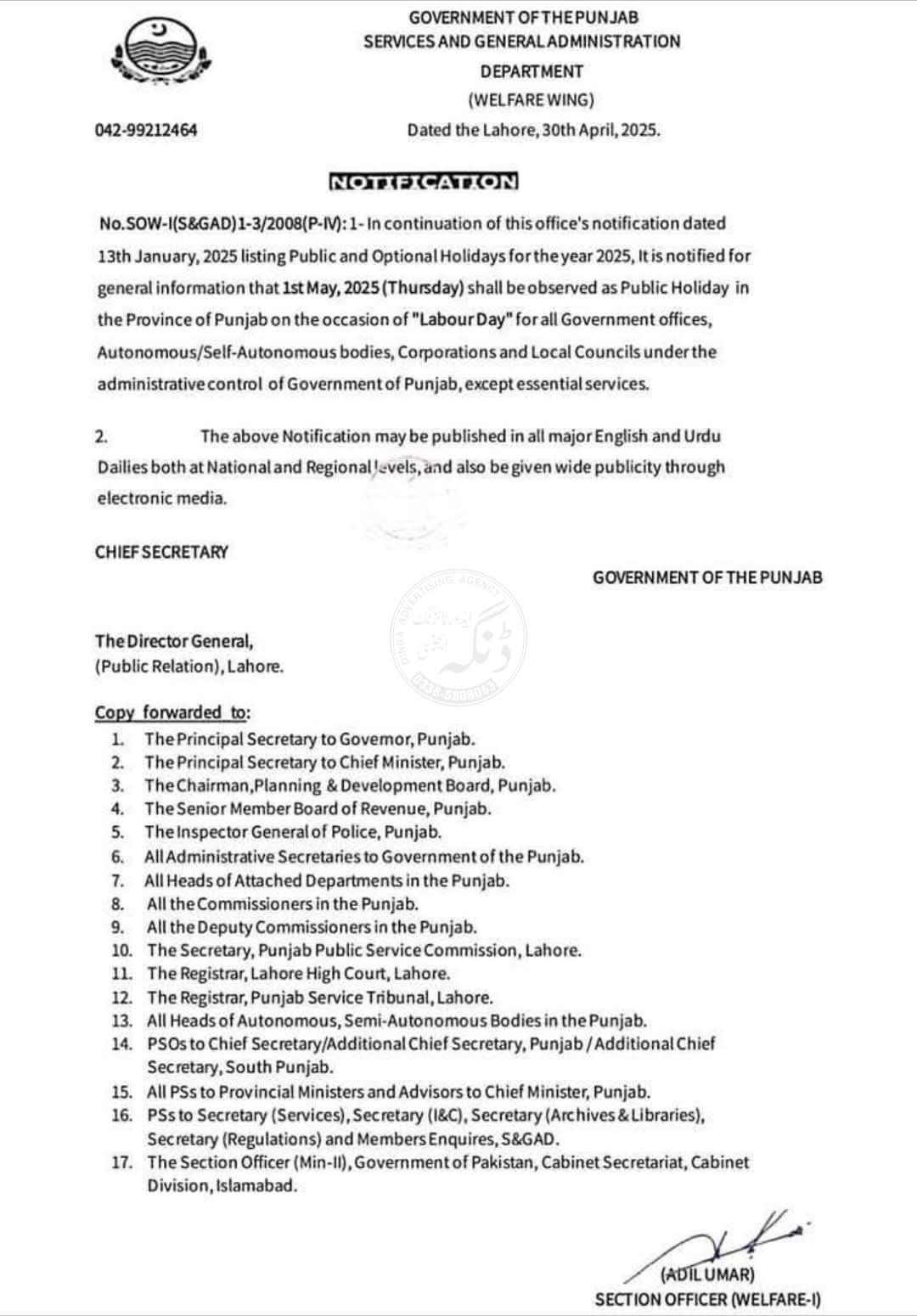 پنجاب میں یکم مئی(یوم مزدور) بروز جمعرات عام تعطیل ہوگی تمام تعلیمی ادارے اور دفاتر بند ہوں گے۔اس سلسلہ میں محکمہ سروسز ویلفیئر ونگ کی طرف سے نوٹیفکیشن جاری کر دیا گیا ہے۔