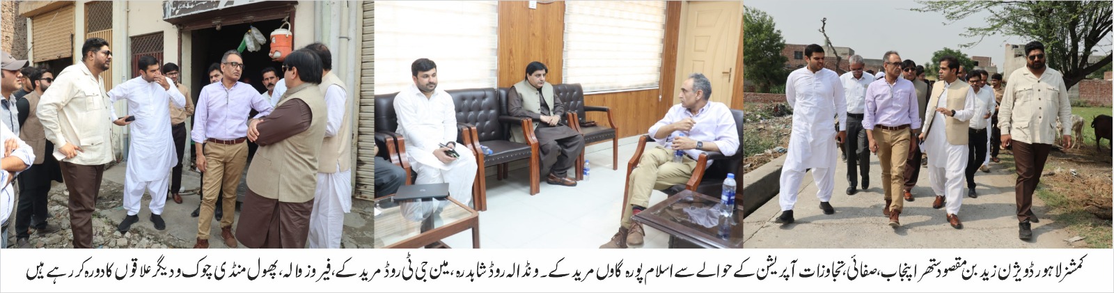 کمشنر لاہور نے تحصیل مرید کے اور تحصیل فیروزوالہ شیخوپورہ کا بھی دورہ کیا۔ کمشنر لاہور نے مین جی ٹی روڈ مرید کے، مریدکے اندرون، اسلام پورہ گاؤں، بھٹیانوالہ اور ونڈالہ کا دورہ کیا۔ انہوں نے مریدکے اندرون میں جاری ایل ڈبلیو ایم سی کے ڈرین صفائی آپریشن کا جائزہ لیا اور دکانداروں، اہل محلہ و شہریوں سے صفائی صورتحال میں بہتری بارے بھی دریافت کیا۔ کمشنر لاہور نے صفائی کیلئے اسلام پورہ گاؤں میں گھروں کی نمبرنگ کرنے کی بھی ہدایت کی۔ انہوں نے اے سی کو تجاوزات کیخلاف کاروائی کرنے کی ہدایت دیتے ہوئے کہا ہے کہ مرید کے سب مین روڈ پر تجاوزات کاروائی پر کوئی لغزش نہیں ہونی چاہئیے۔