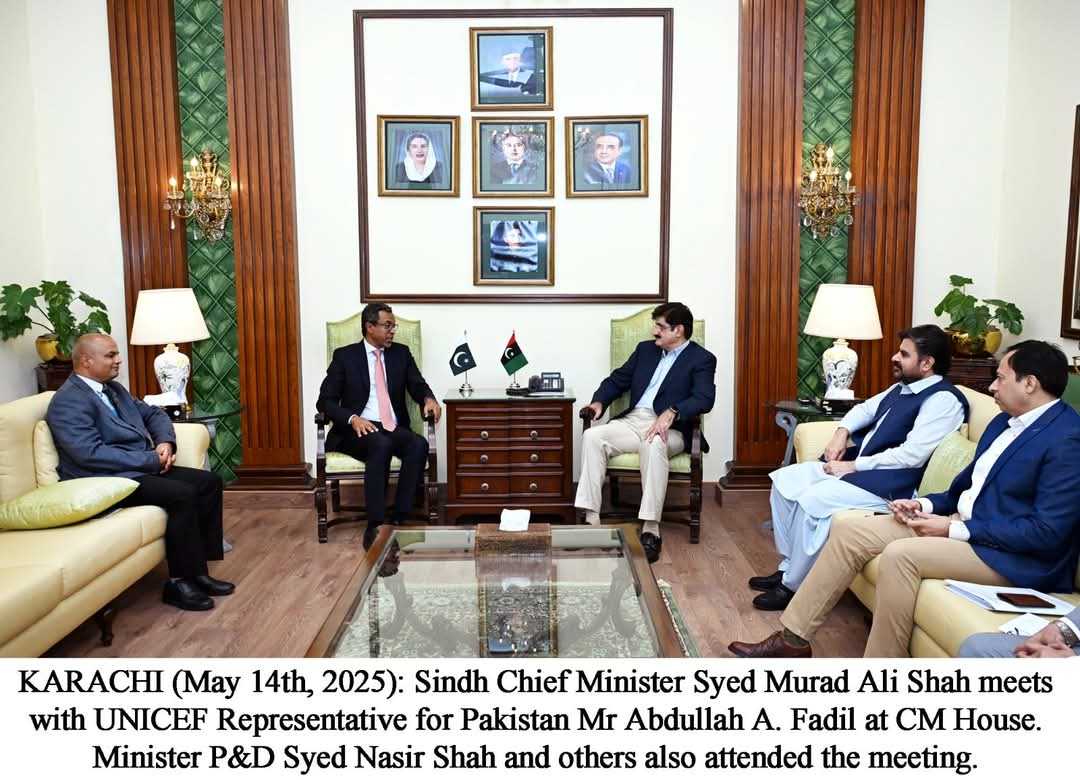 وزیراعلیٰ سندھ سید مراد علی شاہ نے پاکستان میں یونیسیف کے نمائندے عبداللہ اے فاضل اور ان کے وفد سے ملاقات میں سندھ حکومت اور یونیسیف کے درمیان جاری مضبوط شراکت داری پر زور دیا۔