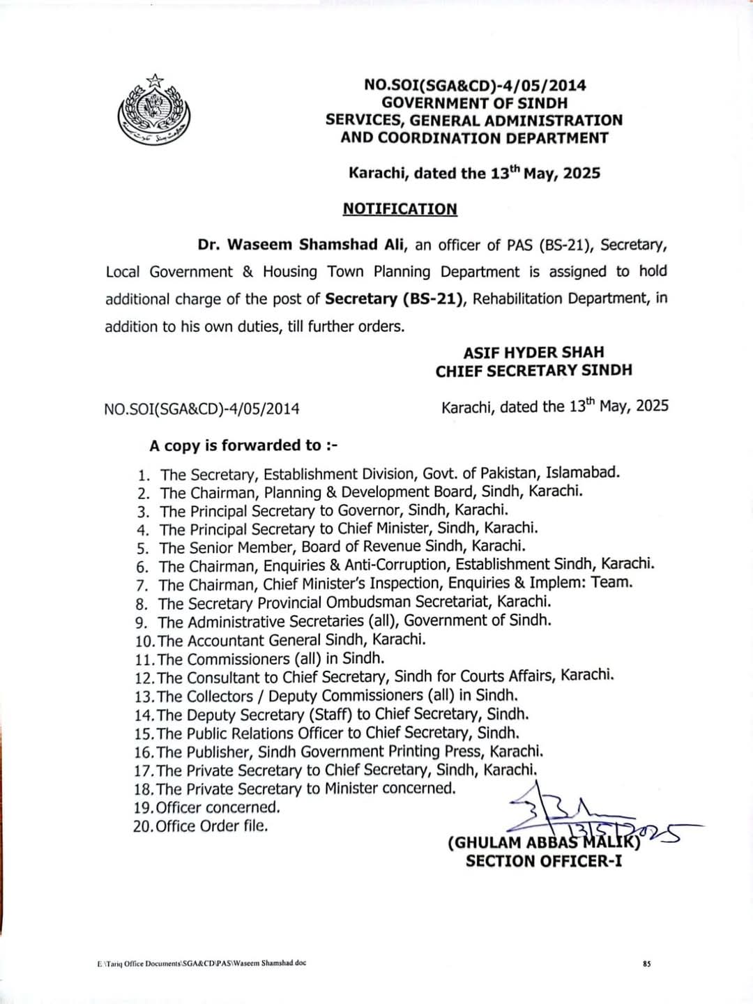 حکومت سندھ نے سیکرٹری بلدیات ڈاکٹر وسیم شمشاد علی کو سیکرٹری بحالیات کے عہدے کا اضافی چارج دے دیا ہے۔چیف سیکرٹری سندھ نے نوٹیفکیشن جاری کر دیا ہے۔