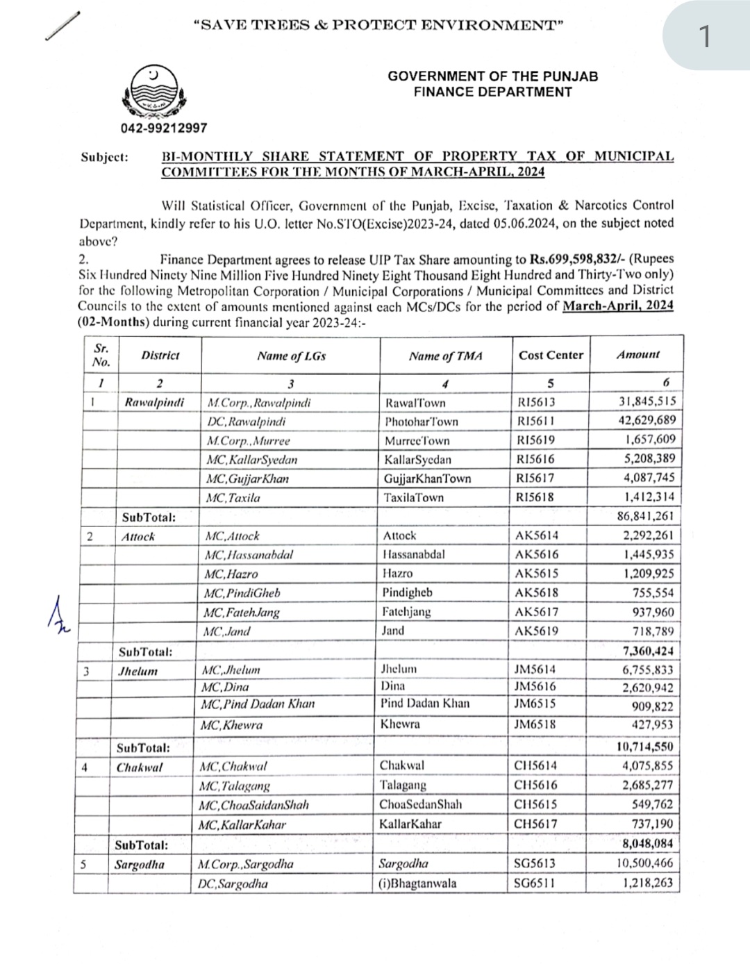 لاہور(بلدیات ٹائمزرپورٹ)محکمہ خزانہ پنجاب نے بلدیاتی اداروں کو 69 کروڑو 95 لاکھ روپے کا یو آئی پی ٹیکس شیئر جاری کر دیا ہے پراپرٹی ٹیکس سے موصول شدہ آمدن سے یہ گرانٹ مارچ ،اپریل کی جاری کی گئی ہے۔اس سلسلے میں جاری نوٹیفکیشن کے مطابق میونسپل کارپوریشن راولپنڈی کو 3 کروڑ 18 لاکھ روپے، میونسپل کارپوریشن سرگودھا کو 1 کروڑ پانچ لاکھ روپے، گوجرانولہ کو 2 کروڑ 23 لاکھ روپے، گجرات 2 کروڑ 24 لاکھ روپے،ملتان 2 کروڑ 17 لاکھ روپے، ساہیوال 1کروڑ 28 لاکھ روپے فیصل آباد 6 کروڑ 41 لاکھ روپے، ڈی جی خان 50 لاکھ روپے اور میونسپل کارپوریشن بہاولپور کو 57 لاکھ روپے جبکہ میٹرو پولیٹن کارپوریشن لاہور کو 12 کروڑ 19 لاکھ 95 ہزار روپے کے یو آئی پی ٹیکس شیئر کا اجراء کیا گیا ہے ۔ضلع شیخوپورہ کے بلدیاتی اداروں کو مجموعی طور پر 1 کروڑ 42 لاکھ روپے، ننکانہ صاحب 27 لاکھ روپے، قصور 1 کروڑ 35 لاکھ روپے ، اوکاڑہ ضلع کے بلدیاتی اداروں کو 1 کروڑ 8 لاکھ روپے ، ضلع رحیم یار خان کے بلدیاتی اداروں کودو کروڑ 20 لاکھ کا یو آئی پی ٹیکس شیئر جاری ہوا ہے۔