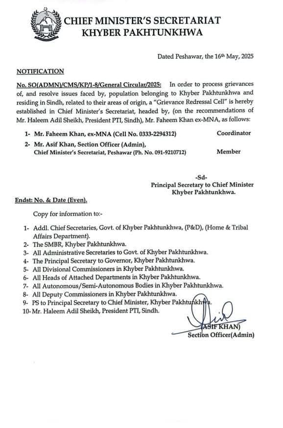 وزیر اعلیٰ خیبرپختونخوا کا بڑا اقدام!سندھ میں مقیم خیبرپختونخوا کے شہریوں کی شکایات کے فوری ازالے کے لیے وزیراعلیٰ سیکریٹریٹ میں شکایتی سیل قائم کر دیا گیا۔وزیراعلیٰ علی امین گنڈاپور نے پی ٹی آئی سندھ کے صدر حلیم عادل شیخ کی سفارش پر نوٹیفکیشن جاری کیا۔فہیم خان کو شکایتی سیل کا انچارج مقرر کیا گیا ہے۔