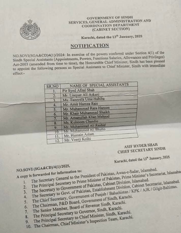 وزیراعلیٰ سندھ نے 8 نئے ترجمان اور 12 نئے معاون خصوصی مقرر کردیے۔ سندھ حکومت کی جانب سے جاری نوٹیفکیشن کے مطابق نادر نبیل گبول، سکھ دیو، بلند خان جونیجو، سمیتہ افضل، تحسین عابدی، ہیرسوھو، سیدہ اقربہ فاطمہ اور مصطفیٰ عبداللہ بلوچ کو حکومتی ترجمان مقرر کیا گیا ہے۔وزیراعلیٰ نے پیر افضل شاہ، لیاقت آسکانی، تنزیلہ امہ حبیبہ، امیر حمزہ اور محمد رضا ہارون، خیرمحمد شیخ،کلثوم چانڈیو، امان اللہ مسعود، محمد علی راشد، محمد علی بھٹو، حسین اسلم اور ویرجی کولھی کو معاون خصوصی مقرر کیا ہے۔
