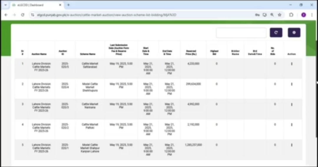حکومت پنجاب کے ای گورننس وژن کے تحت محکمہ بلدیات نے صوبے بھر میں مویشی منڈیوں کی شفاف اور جدید طرز پر نیلامی کو یقینی بنانے کے لیے آئی ٹی بیسڈ سسٹم کے تحت ای آکشن متعارف کروایا ہے۔ اس نظام کے تحت لاہور اور ملتان ڈویژن کی مویشی منڈیوں کی ای نیلامی کا عمل کامیابی سے مکمل کر لیا گیا ہے، جس میں مجموعی طور پر اربوں روپے کی آن لائن بولیاں موصول ہوئیں۔پنجاب کیٹل مارکیٹ مینجمنٹ اینڈ ڈویلپمنٹ کمپنی کے زیر اہتمام ہونے والی اس نیلامی میں شاہ پور کانجراں منڈی کی سب سے بڑی بولی طیب منظور کی جانب سے 1 ارب 50 کروڑ روپےرہی، جبکہ قریشی گروپ نے ماڈل مویشی منڈی شیخوپورہ کے لیے 48 کروڑ 67 لاکھ 80 ہزار 982 روپےاور جسونت گڑھ منڈی کے لیے 1 ارب 57 کروڑ 12 لاکھ 11 ہزار 600 روپے کی بولیاں دے کر نمایاں کامیابی حاصل کی۔اسی طرح پتوکی، صفدرآباد، ننکانہ، لڈن، ماچھی وال، جملیرا، خانیوال، دنیاپور، جلالپور، گگھو، وہاڑی سٹیڈیم اور ٹبہ سلطان کی منڈیوں کے لیے بھی کامیاب آن لائن بولیاں موصول ہوئیں۔ ملتان ڈویژن کی 10 منڈیوں کے لیے 1 ارب 17 کروڑ 66 لاکھ 77 ہزار روپےکی ریزرو پرائس مقرر کی گئی تھی، جب کہ ان پر 2 ارب 63 کروڑ 67 لاکھ 11 ہزار 600 روپےکی کامیاب بولیاں لگائی گئیں۔محکمہ بلدیات کے مطابق،لاہور اور ملتان ڈویژن میں ای آکشن کا کامیاب انعقاد اس بات کا ثبوت ہے کہ ڈیجیٹل نیلامی کے ذریعے نہ صرف کرپشن کا خاتمہ ممکن ہے بلکہ اس سے حکومتی ریونیو میں نمایاں اضافہ اور نظام میں شفافیت کو یقینی بنایا جا سکتا ہے۔ای آکشن کے اگلے مرحلے میں 22 مئی کو سرگودھا، گوجرانوالہ اور بہاولپورڈویژن جبکہ 23 مئی کو ساہیوال، راولپنڈی اور ڈی جی خان ڈویژن کی مویشی منڈیوں کی نیلامی کی جائے گی۔ صوبہ بھر میں 9 ڈویژنز کی 112 مویشی منڈیوں کی ای نیلامی کا عمل جاری ہے۔اس حوالے سے سیکرٹری لوکل گورنمنٹ نے کہا ہے کہ لاہور اور ملتان ڈویژن میں ای آکشن کے کامیاب نتائج اس نظام کی شفافیت، میرٹ اور جدیدیت کی واضح مثال ہیں۔ یہ ماڈل مویشی منڈیوں کے نظام کو کرپشن سے پاک، منظم اور قابل نگرانی بنانے کی جانب اہم پیش رفت ہے، جسے دیگر شعبوں میں بھی وسعت دی جائے گی۔