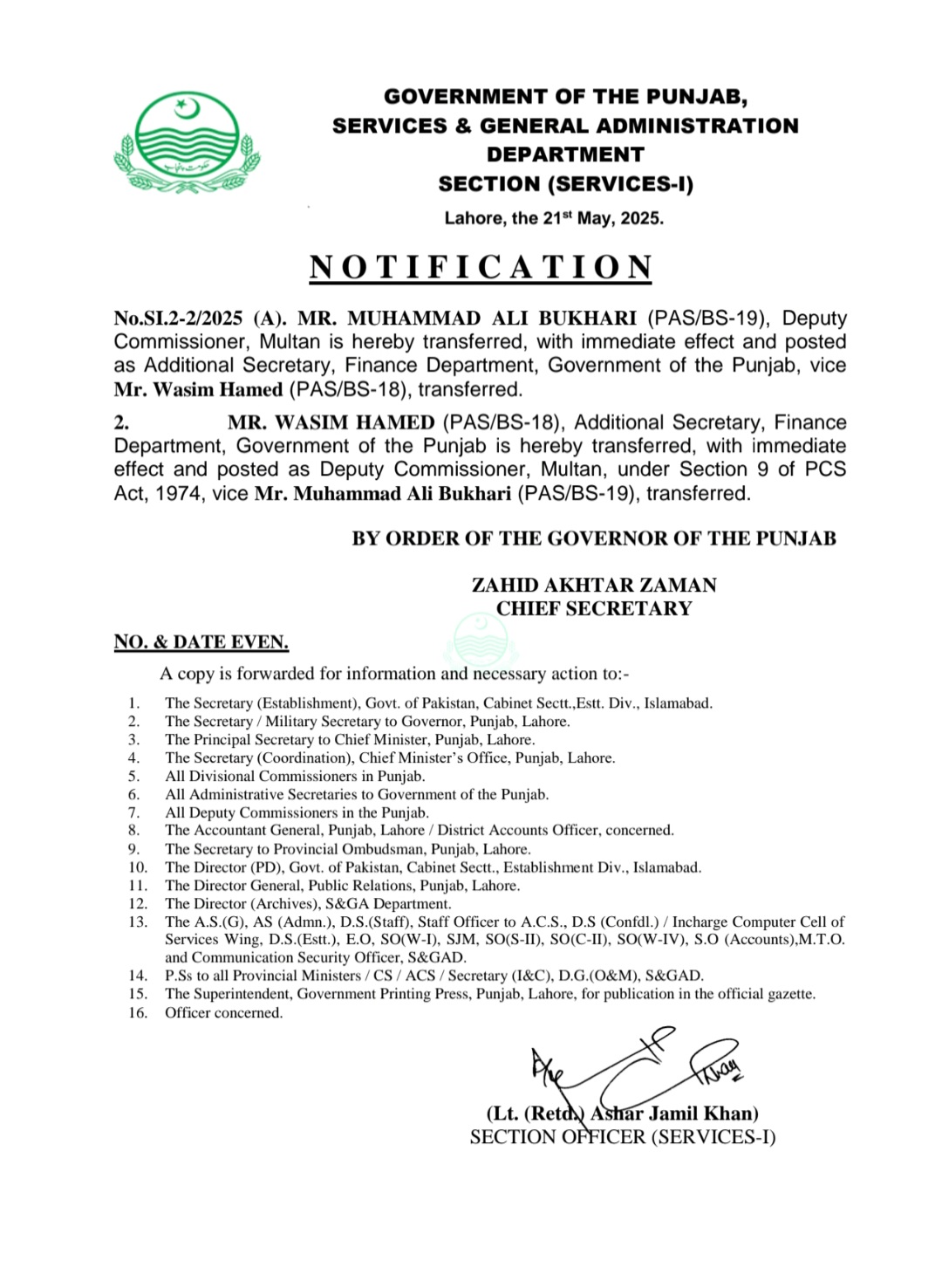 محکمہ سروسز پنجاب نےڈپٹی کمشنر ملتان محمد علی بخاری کے تبادلے کے احکامات جاری کر دیئے ہیں۔محمد علی بخاری ایڈیشنل سیکرٹری محکمہ خزانہ تعینات کر دیا گیا ہے۔ایڈیشنل سیکرٹری محکمہ خزانہ وسیم احمد کوڈپٹی کمشنر ملتان تعینات کیا گیا ہے۔چیف سیکرٹری پنجاب زاہد اختر زمان کی جانب سے نوٹیفکیشن جاری کر دیا گیا ہے۔