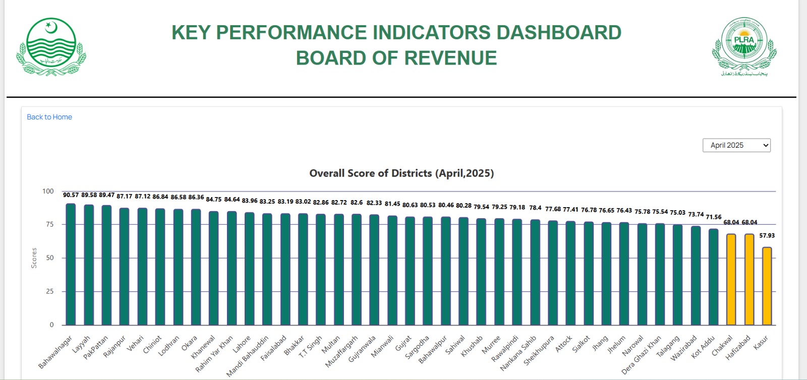 پنجاب حکومت نے ماہ اپریل 2025ء میں پنجاب کے تمام اضلاع کی کارکردگی رپورٹ جاری کردی ہے۔کارکردگی کے لحاظ سے ضلع بہاولنگر پہلے نمبر پر، ضلع لیہ دوسرے نمبر پر، پاکپتن تیسرے نمبر پر رہا۔راجن پور چوتھے، وہاڑی پانچویں، چنیوٹ 6ویں، لودھراں 7ویں نمبر پر رہا۔ضلع اوکاڑہ 8ویں، خانیوال 9ویں، رحیم یار خان 10ویں نمبر پر اور لاہور 11ویں نمبر پر ہے۔ضلع منڈی بہاؤالدین 12ویں نمبر پر، فیصل آباد 13ویں نمبر پر، بھکر 14ویں نمبر پر ہے۔ٹوبہ ٹیک سنگھ 15ویں نمبر پر، ملتان 16ویں نمبر پر، مظفرگڑھ 17ویں نمبر پر اور گوجرانوالہ 18ویں نمبر پر رہا۔میانوالی 19ویں نمبر پر، گجرات 20ویں نمبر پر، سرگودھا 21ویں نمبر پر اور بہاولپور 22ویں نمبر پر رہا۔ساہیوال 23 ویں نمبر پر، خوشاب 24ویں نمبر پر، مری 25ویں نمبر پر اور راولپنڈی 26ویں نمبر پر ہے۔ننکانہ صاحب 27ویں، شیخوپورہ 28ویں نمبر پر، اٹک 29ویں نمبر پر اور سیالکوٹ 30ویں نمبر پر رہا۔جھنگ 31ویں نمبر پر، جہلم 32ویں نمبر پر، نارووال 33ویں نمبر پر اور ڈیرہ غازی خان 34ویں نمبر پر ہے۔تلہ گنگ 35ویں، وزیر آباد 36ویں، کوٹ اددو 37ویں، چکوال 38ویں، حافظ آباد 39ویں نمبر اور ضلع قصور آخری نمبر پر رہا۔KEY PERFORMANCE INDICATORS DASHBOARD BOARD OF REVENUE ہر ماہ مرتب کی جاتی ہے۔