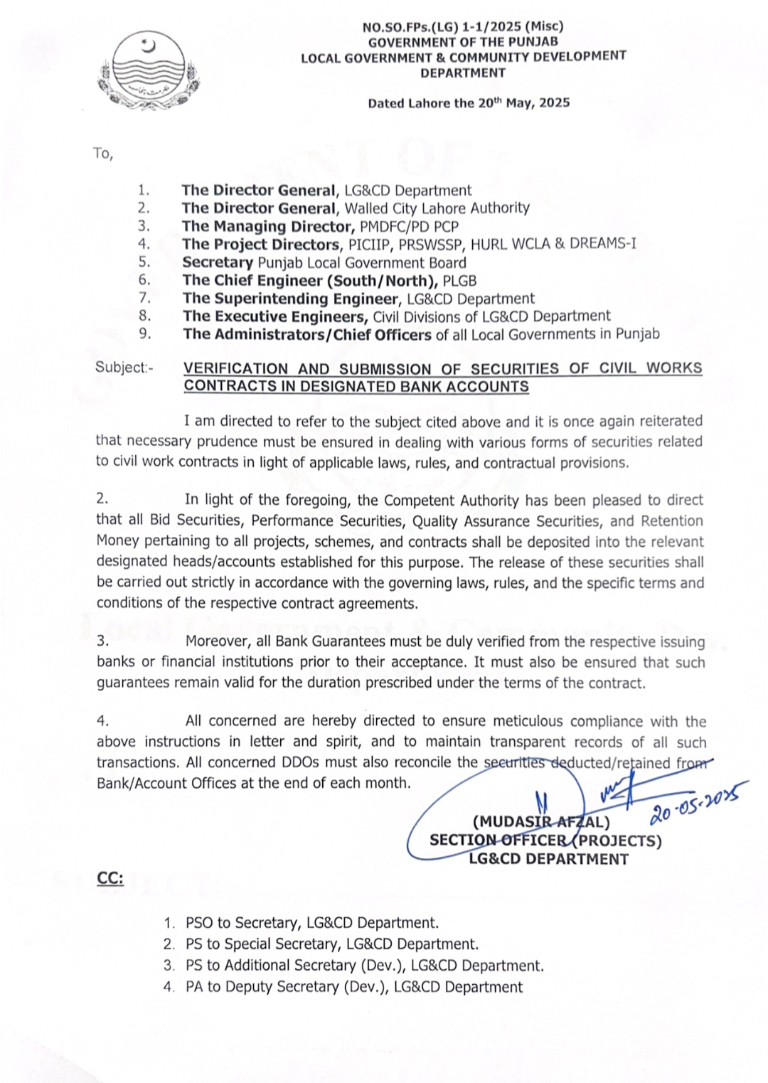 :-موضوع،نامزد بینک اکاؤنٹس میں سول ورکس کنٹریکٹس کی سیکیورٹیز کی تصدیق اور جمع کروانا، مجھے مندرجہ بالا مضمون کا حوالہ دینے کی ہدایت کی گئی ہے اور ایک بار پھر اس بات کا اعادہ کیا جاتا ہے کہ قابل اطلاق قوانین، قواعد اور معاہدے کی دفعات کی روشنی میں سول ورک کنٹریکٹس سے متعلق مختلف قسم کی سیکیورٹیز سے نمٹنے میں ضروری احتیاط کو یقینی بنایا جانا چاہیے۔ 2. مذکورہ بالا کی روشنی میں، مجاز اتھارٹی کو یہ ہدایت کرتے ہوئے خوشی ہوئی ہے کہ تمام بولی کی سیکیورٹیز، پرفارمنس سیکیورٹیز، کوالٹی ایشورنس سیکیورٹیز، اور تمام پروجیکٹس، اسکیموں، اور معاہدوں سے متعلق ریٹینشن منی اس مقصد کے لیے قائم کیے گئے متعلقہ نامزد ہیڈز/اکاؤنٹس میں جمع کر دی جائیں گی۔ ان سیکیورٹیز کی رہائی حکومتی قوانین، قواعد، اور متعلقہ معاہدے کے معاہدوں کی مخصوص شرائط و ضوابط کے مطابق سختی سے کی جائے گی۔ 3. مزید برآں، تمام بینک گارنٹیوں کو قبول کرنے سے پہلے متعلقہ جاری کرنے والے بینکوں یا مالیاتی اداروں سے درست طریقے سے تصدیق کر لینی چاہیے۔ اس بات کو بھی یقینی بنایا جانا چاہیے کہ اس طرح کی ضمانتیں معاہدے کی شرائط کے تحت مقرر کردہ مدت کے لیے درست رہیں۔4. تمام متعلقہ افراد کو ہدایت کی جاتی ہے کہ وہ مندرجہ بالا ہدایات کی مکمل طور پر مکمل تعمیل کو یقینی بنائیں اور اس طرح کے تمام لین دین کے شفاف ریکارڈ کو برقرار رکھیں۔ تمام متعلقہ ڈی ڈی اوز کو ہر مہینے کے آخر میں بینک/اکاؤنٹ آفس سے کٹوتی/رکھائی گئی سیکیورٹیز کو بھی ملانا چاہیے۔