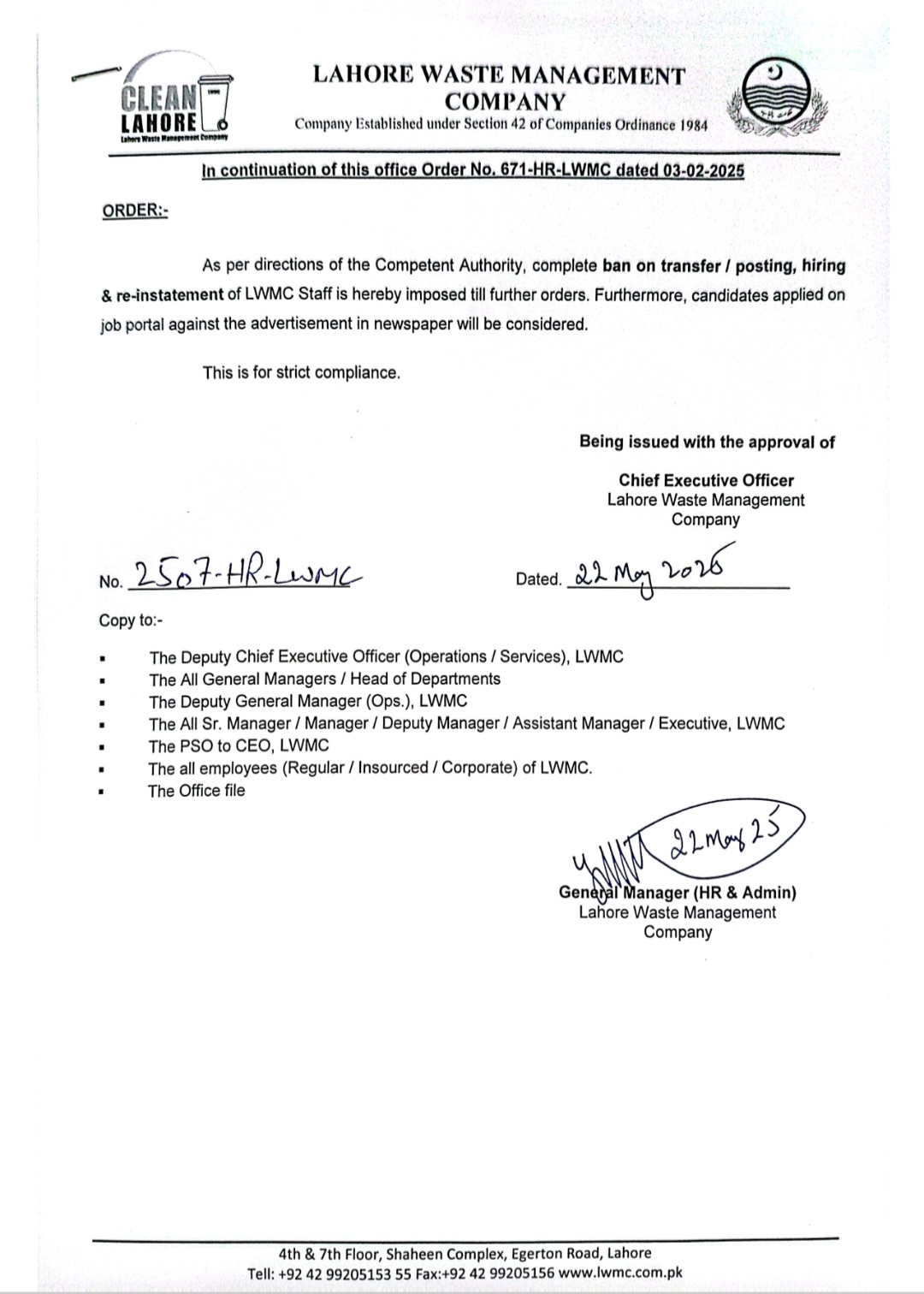 لاہور ویسٹ مینجمنٹ کمپنی کی جانب سے سال کے سب سے اہم اور گرینڈ صفائی آپریشن کی جامع حکمتِ عملی کو کامیاب بنانے کے لیے موثر اقدامات کیے جا رہے ہیں۔اس مقصد کے حصول کے لیے ایل ڈبلیو ایم سی نے عید قربان سے قبل تمام سینٹری ورکرز اورآفیسرز کی ٹرانسفر پوسٹنگ کومکمل بین کر دیا ہے۔فیصلے پر عملدرآمد کے لیے ایل ڈبلیو ایم سی انتظامیہ نے نوٹیفیکیشن بھی جاری کر دیا۔ ترجمان ایل ڈبلیو ایم سی عمر چوہدری کے مطابق ٹرانسفر پوسٹنگ پر بین عید قربان میگا صفائی آپریشن کی تیاریوں کے پیش نظر لگایا گیا ہے۔عید قربان میگا صفائی آپریشن کی تیاریاں آخری مراحل میں ہیں۔ٹرانسفر پوسٹنگ پر مکمل بین سے بہترین حکمت عملی مرتب کرنے میں مدد ملے گی، تاہم اخباری اشتہارات میں اعلان کردہ آسامیوں پر امیدواران آنلائن پورٹل پر اپلائی کر سکیں گے۔