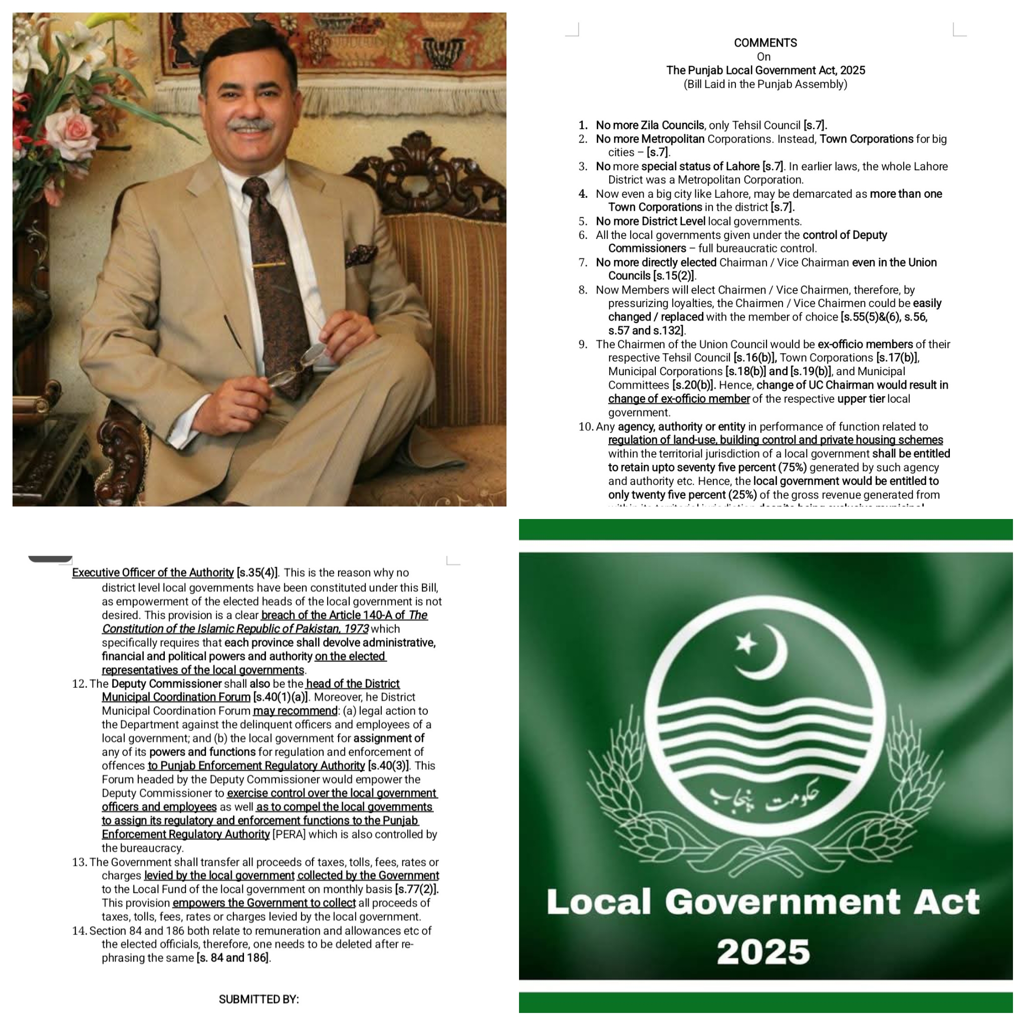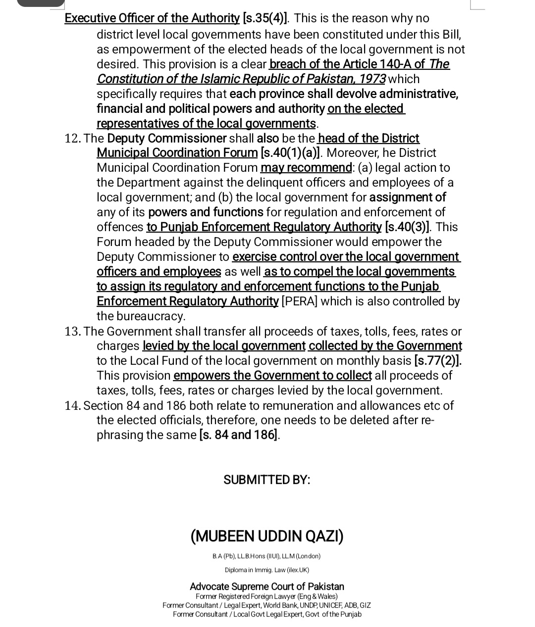 آئین کے آرٹیکل 140-A کی خلاف ورزی پاکستان کے آئین (1973) کے آرٹیکل 140-A کے تحت ہر صوبے کو انتظامی، مالی اور سیاسی اختیارات مقامی حکومتوں کی سطح پر منتخب نمائندوں کو دینے چاہئیں۔ بل منتخب کنٹرول کو ہٹا کر اور ڈپٹی کمشنروں کے ماتحت بیوروکریٹک کنٹرول سے اس کی جگہ لے کر اس آئینی تقاضے کی خلاف ورزی کرتا ہے۔ضلعی سطح کی مقامی حکومتوں کی تشکیل نہ کرنے سے بل منتخب بلدیاتی نمائندوں کی سیاسی اور انتظامی خود مختاری کو کمزور کرتا ہے۔منتخب عہدیداروں کے معاوضے پر متضاد دفعہ (84 اور 186) سیکشن 84 اور 186 دونوں منتخب عہدیداروں کے معاوضے اور الاؤنسز سے متعلق ہیں۔