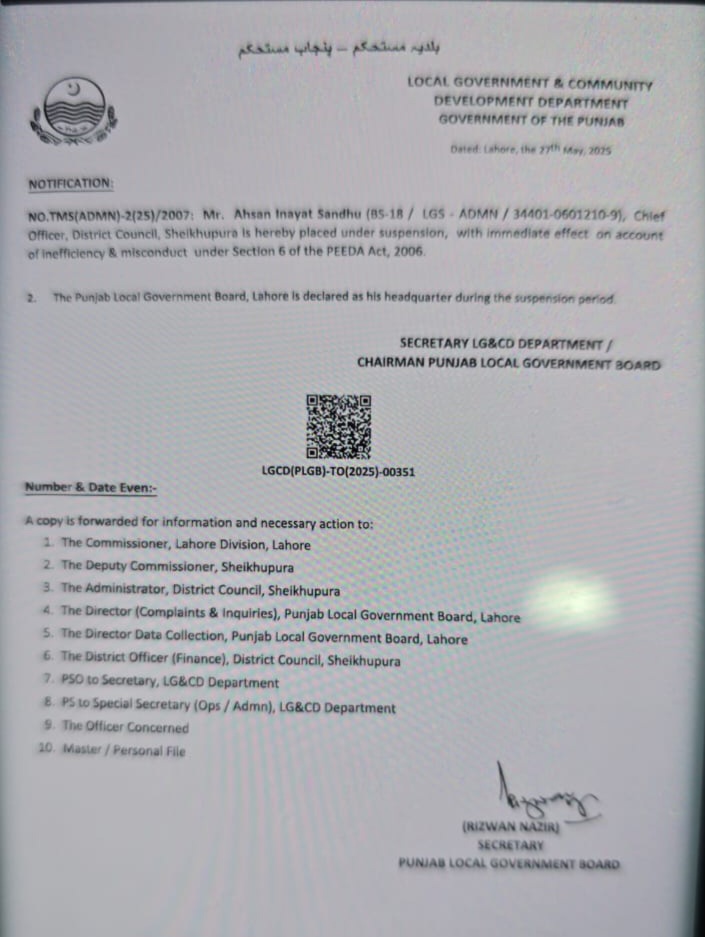 محکمہ بلدیات پنجاب نے نااہلی اور فرائض میں پر چیف آفیسر ضلع کونسل شیخوپورہ احسن عنایت سندھو کو معطل کر دیا ہے۔سیکرٹری لوکل گورنمنٹ اینڈ کمیونٹی ڈویلپمنٹ نے پیڈا ایکٹ کے تحت انکوائری کا بھی حکم دے دیا ہے۔
