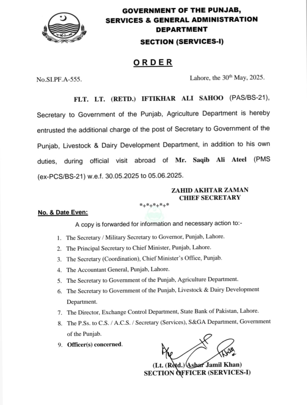 پنجاب حکومت نے 2 افسران کو او ایس ڈی اور دو کو اضافی ذمہ داریاں سونپنے کے احکامات جاری کر دیئے ۔ سیکرٹری پرائس کنٹرول اینڈ کموڈیٹیز مینجمنٹ ڈیپارٹمنٹ محمد اجمل بھٹی کو تبدیل کر کے محکمہ ایس اینڈ جی اے ڈی رپورٹ کرنے کا حکم ، ڈائریکٹر جنرل ( خوراک ) کین کمشنر پنجاب لیفٹیننٹ (ر) محمد شعیب خان جدون کو بھی محکمہ ایس اینڈ جی اے ڈی رپورٹ کرنے کا حکم دیاگیا ہے،سیکرٹری محکمہ انڈسٹریز ، کامرس اینڈ انویسٹمنٹ محمد عمر مسعود کو سیکرٹری پرائس کنٹرول اینڈ کموڈیٹیز مینجمنٹ ڈیپارٹمنٹ کا اضافی چارج سونپ دیا گیا اور ڈائریکٹر جنرل انڈسٹریز ، پرائسز، ویٹ آصف علی فرخ کو ڈائریکٹر جنرل ( خوراک ) کین کمشنر پنجاب کا اضافی چارج سونپ دیا گیا ۔ چیف سیکرٹری پنجاب زاہد اختر زمان کی منظوری کے بعد محکمہ سروسز اینڈ جنرل ایڈمنسٹریشن نے نوٹیفکیشن جاری کر دیا۔