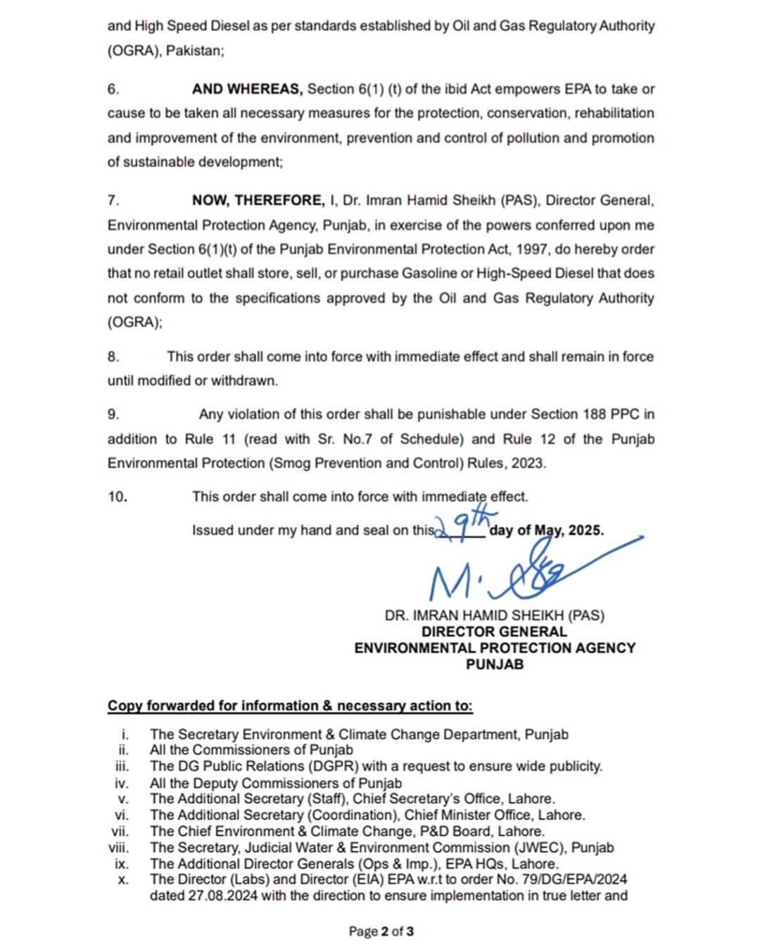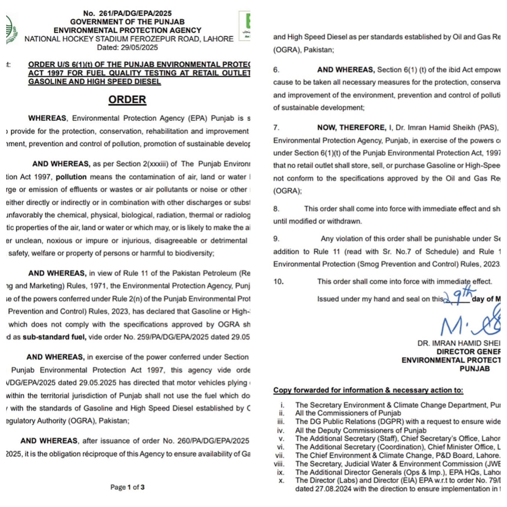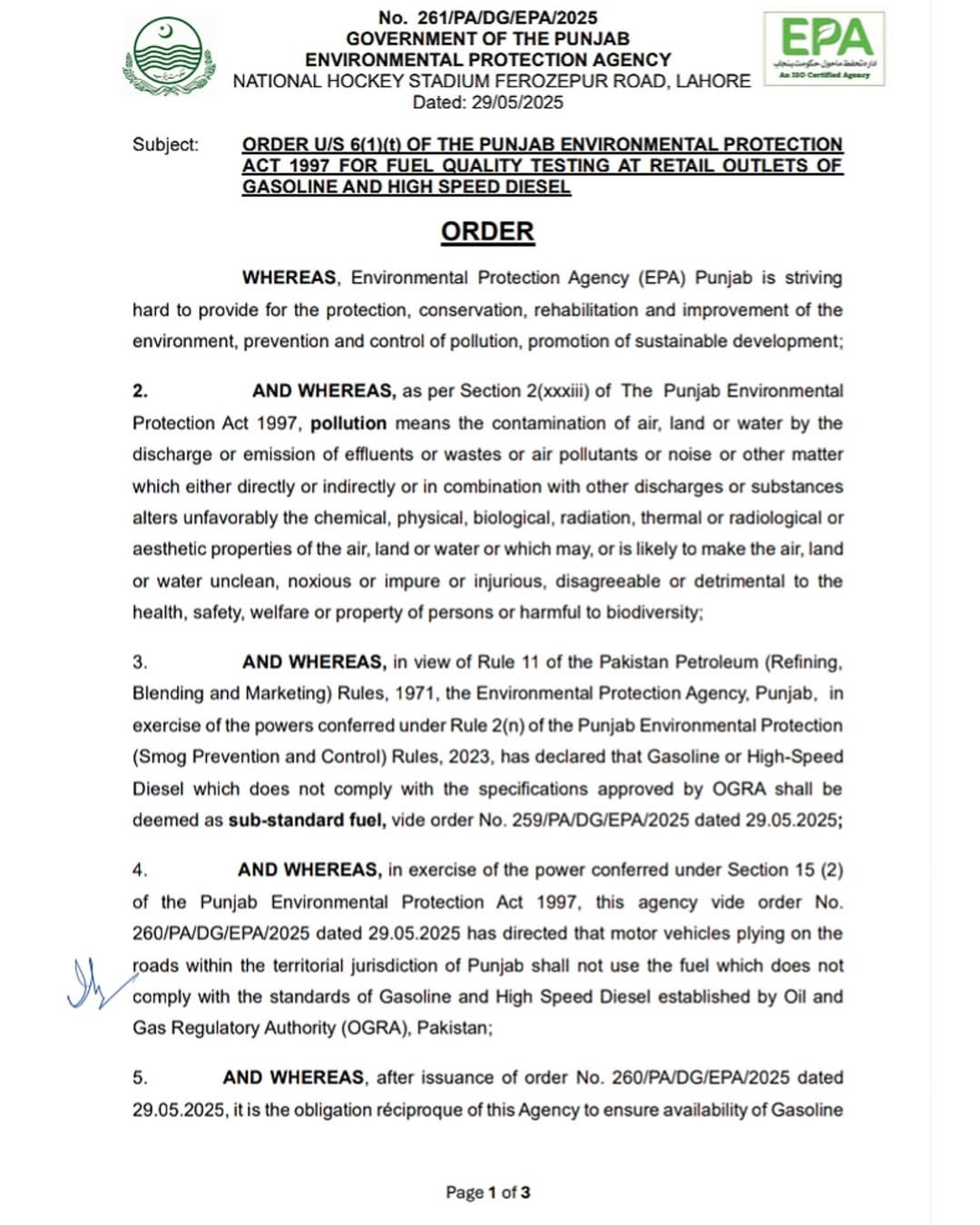 ڈی جی ای پی اے، ڈاکٹر عمران حامد شیخ کی جانب سے نوٹیفکیشن جاری کیا گیا ہے۔ماحولیاتی آلودگی پر قابو پانے کے لئے پنجاب بھر میں غیر معیاری فیول کے استعمال پر پابندی لگا دی گئی ہے۔پٹرول اسٹیشن پر صرف اوگرا سے منظور شدہ فیول کی خرید و فروخت کی اجازت ہوگی۔پابندی کا اطلاق فی الفور ہوگا۔