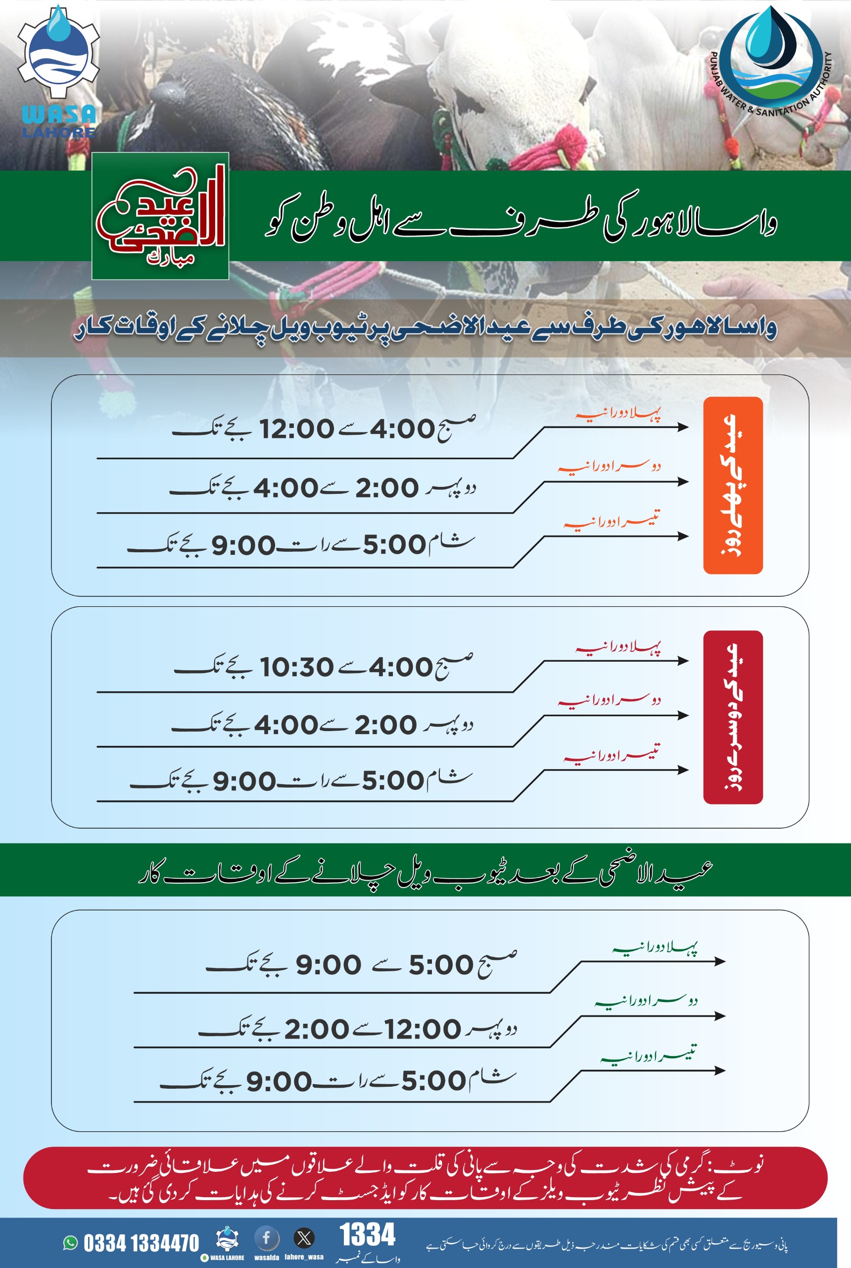 حکومت پنجاب کے وژن کی روشنی میں واسا لاہور متحرک،واسا لاہور نے ایم ڈی واسا غفران احمد کی خصوصی ہدایات پر عید الاضحٰی پر ٹیوب ویل چلانے کے اوقات کار جاری کر دیے۔عید الاضحٰی کے پہلے روز تین دورانیوں میں صارفین تک پانی پہنچایا جائے گا۔عیدالاضحٰی کے دن پہلا دورانیہ صبح 4:00 بجے سے دوپہر 12:00 بجے تک ہوگا۔دوسرا دورانیہ دوپہر 2:00 بجے سے شام 4:00 بجے تک رہے گا۔اس طرح تیسرا اور آخری دورانیہ شام 5 بجے سے لے کر رات 9:00 بجے تک جاری رہے گا۔عید الاضحٰی کے دوسرے روز سے ٹیوب ویل چلانے کے اوقات کار کچھ اس طرح ہوں گے۔پہلا دورانیہ صبح 4 بجے سے صبح 10:30 بجے تک ہوگا۔دوسرا دورانیہ دوپہر 2 بجے سے 4 بجے تک جاری رہے گا۔تیسرا دورانیہ شام 5 بجے سے رات 9 بجے تک جاری رہے گا۔عید الاضحی کے بعد اوقات کار کچھ اس طرح ہوں گے۔