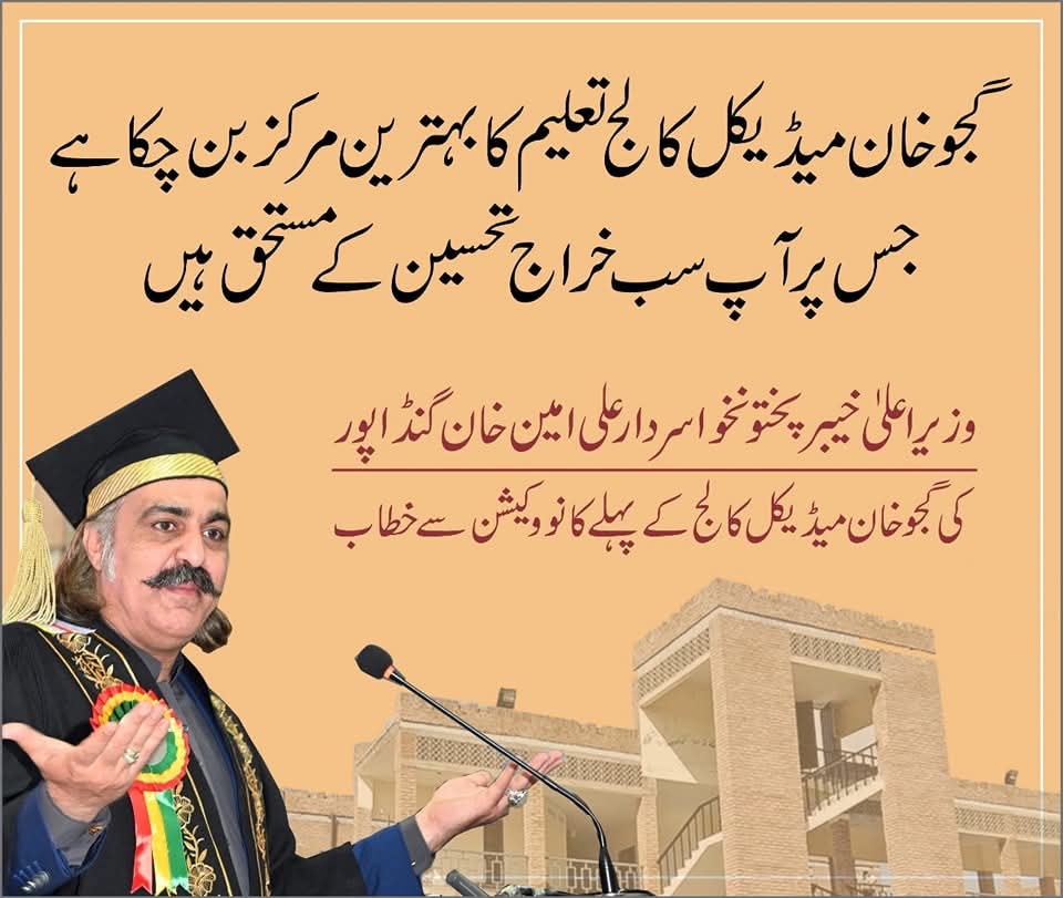 وزیر اعلیٰ خیبر پختونخوا علی امین خان گنڈاپور کا دورہ صوابی، وزیراعلٰی نے گجو خان میڈیکل کالج کے پہلے کانووکیشن میں بحیثیت مہمان خصوصی شرکت کی۔ اراکین قومی اسمبلی اسد قیصر ،شہرام ترکئی، رکن صوبائی کابینہ رنگیز احمد ، کالج فیکلٹی و انتظامیہ، گریجویٹس اور ان کے والدین بھی شریک ہوئے۔ کانووکیشن میں 100 سے زائد طلبہ میں گولڈ میڈلز اور 200 سے زائد طلبہ میں ڈگریاں تقسیم کی گئیں۔ وزیراعلیٰ علی امین خان گنڈاپور کا کانووکیشن سے خطاب کرتے ہوئے کہا کہ گجو خان میڈیکل کالج کے کانووکیشن میں شرکت نہایت خوشی اور اعزاز کا باعث ہے، تمام گریجویٹس، ان کے والدین اور اساتذہ کو مبارکباد پیش کرتاہوں، گریجویٹس آج سے عملی میدان میں قدم رکھنے جارہے ہیں، یہ نئے سفر کی شروعات ہیں، اگر بیمار انسانیت کی خدمت کے جذبے کے تحت اس سفر پرچلیں گے تو دُنیا و آخرت دونوں میں سرخرو ہوں گے، مریض آپ کو اپنا مسیحا سمجھتے ہیں اور آپ پر اعتماد کرتے ہیں، ان کے اس اعتماد کو متزلزل نہ ہونے دیں۔ایک مریض کو آپ کی طرف سے اچھے رویے کی ضرورت ہوتی ہے اور یہی وہ چیز ہے جو لوگ ہمیشہ یاد رکھتے ہیں، آپ نے زندگی میں کنفیوژن سے نکل کر بہتر فیصلے کرنے ہیں، دوسروں کا بھلا سوچنا اور بھلا کرنا ہے، ہماری حکومت کی تعلیم و صحت کے شعبوں پر زیادہ توجہ ہے، ان شعبوں میں وسیع پیمانے پر سرمایہ کاری کر رہے ہیں، بھرپور کوشش ہے اپنے تعلیمی اداروں کی ڈگریوں کا معیار بڑھائیں اور انہیں بین الاقوامی سطح پر منوائیں۔ آئندہ بجٹ میں شعبہ تعلیم کا حصہ مزید 13 فیصد بڑھا رہے ہیں، سکالرشپس کی تعداد بھی بڑھا دی ہے، گزشتہ 77 سالوں میں سکالرشپس انڈومنٹ فنڈ 1.2 ارب تھا، ہم نے اسے 2.4 ارب روپے کر دیا ہے، موجودہ صوبائی حکومت نے 1500 نرسز کی بین الاقوامی یونیورسٹیز سے ٹریننگ کروائی ہے۔