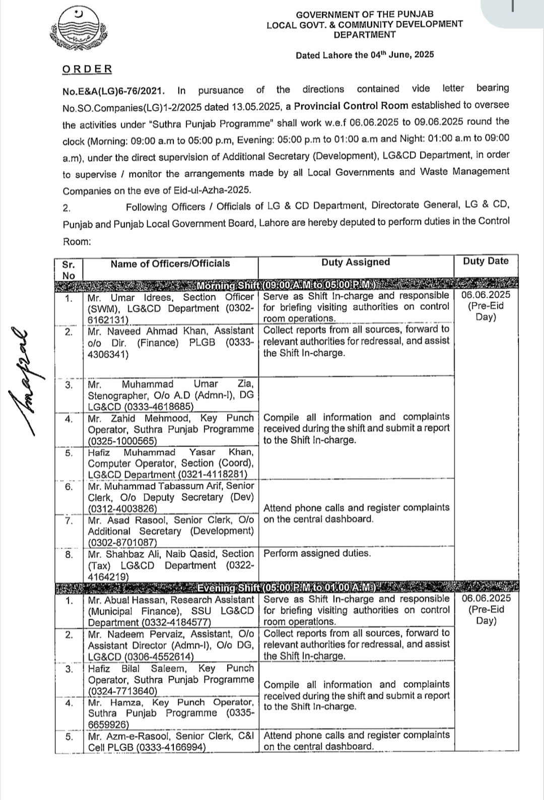 عیدالاضحیٰ کے موقع پر وزیر اعلیٰ پنجاب مریم نواز شریف کی خصوصی ہدایات پر صوبہ بھر میں صفائی و ستھرائی کے انتظامات مکمل کر لیے گئے ہیں۔ اس سلسلے میں سول سیکرٹریٹ لاہور میں ایک مربوط اور ہمہ وقت فعال صوبائی کنٹرول روم قائم کر دیا گیا ہے، جہاں 100 سے زائد افسران اور ملازمین کی ڈیوٹیاں لگا دی گئی ہیں۔