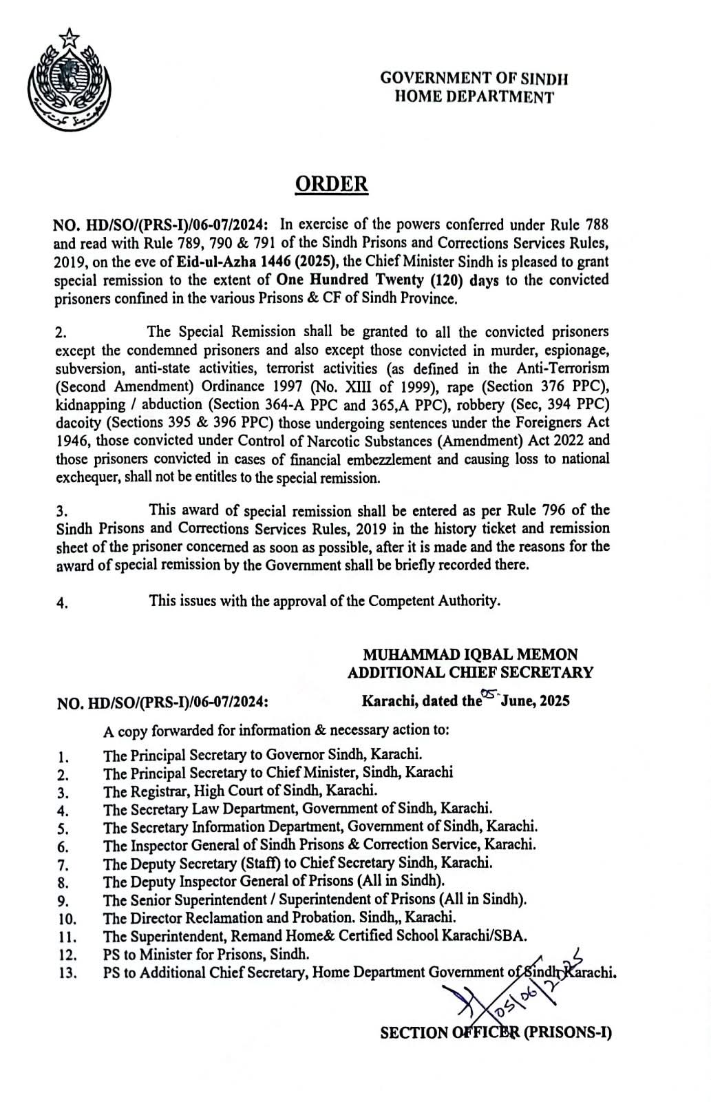 وزیراعلیٰ سندھ سید مراد علی شاہ نے عیدالاضحیٰ 1446 ہجری (2025) کے موقع پر سندھ بھر کی جیلوں اور اصلاحی مراکز میں قید سزا یافتہ قیدیوں کے لیے 120 دن کی خصوصی معافی کی منظوری دے دی ہے۔ وزیراعلیٰ سندھ کا کہنا ہے کہ یہ خصوصی معافی تمام سزا یافتہ قیدیوں پر لاگو ہوگی، سوائے ان کے جو سزائے موت کے قیدی ہیں یا جنہیں قتل، جاسوسی، تخریب کاری، ریاست مخالف اور دہشتگردی سرگرمیوں، زنا ، اغوا، ڈکیتی، رہزنی، اور مالی بدعنوانی جیسے سنگین جرائم میں سزا ہو چکی ہو یا جنہوں نے قومی خزانے کو نقصان پہنچایا ہو، ایسے قیدی اس معافی کے مستحق نہیں ہوں گے۔ یہ معافی ہر اہل قیدی کی تاریخ وار شیٹ اور معافی ریکارڈ میں درج کی جائے گی۔
