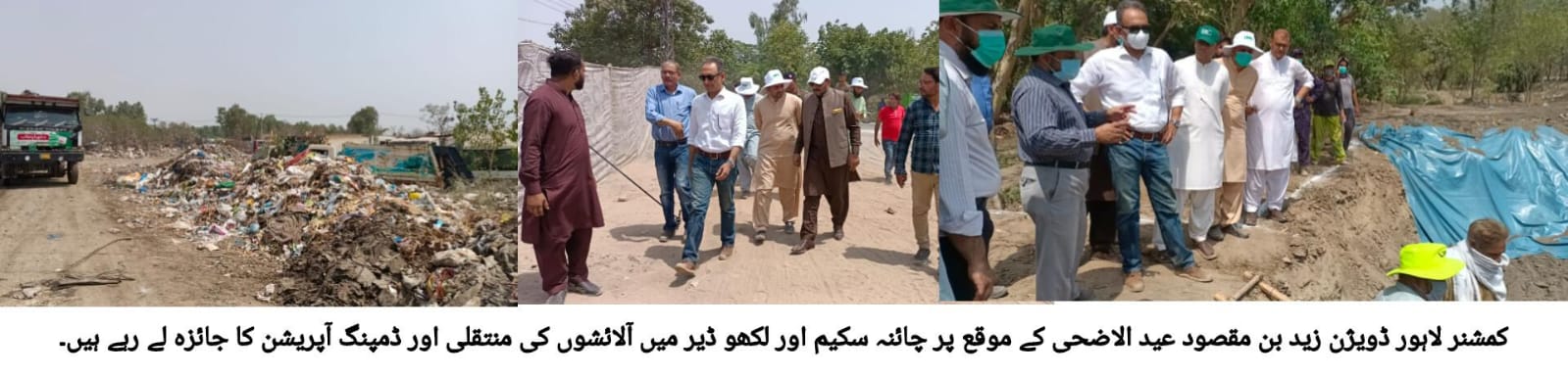 کمشنر لاہور ڈویژن زید بن مقصود نے عید الاضحٰی کے تیسرے روز صفائی آپریشن جائزہ کے حوالے سے ہربنس پورہ تا ٹھوکر کینال روڈ، چوک ناخدا شاد باغ، عامر روڈ، چائنہ سکیم اور لکھو ڈیر کا دورہ کیا۔ کمشنر لاہور نے صفائی کیمپس، روڈز صفائی اور عارضی و مرکزی ڈمپنگ سائٹس کے دورے کیے، انہوں نے چائنہ سکیم میں عارضی کلیکشن سائٹ سے مرکزی ڈمپنگ سائٹس پر آلائشیوں کی منتقلی آپریشنز اور شہر کی مرکزی ڈمپنگ سائٹ لکھو ڈیر میں مرکزی ڈمپنگ آپریشن کا جائزہ لیا۔