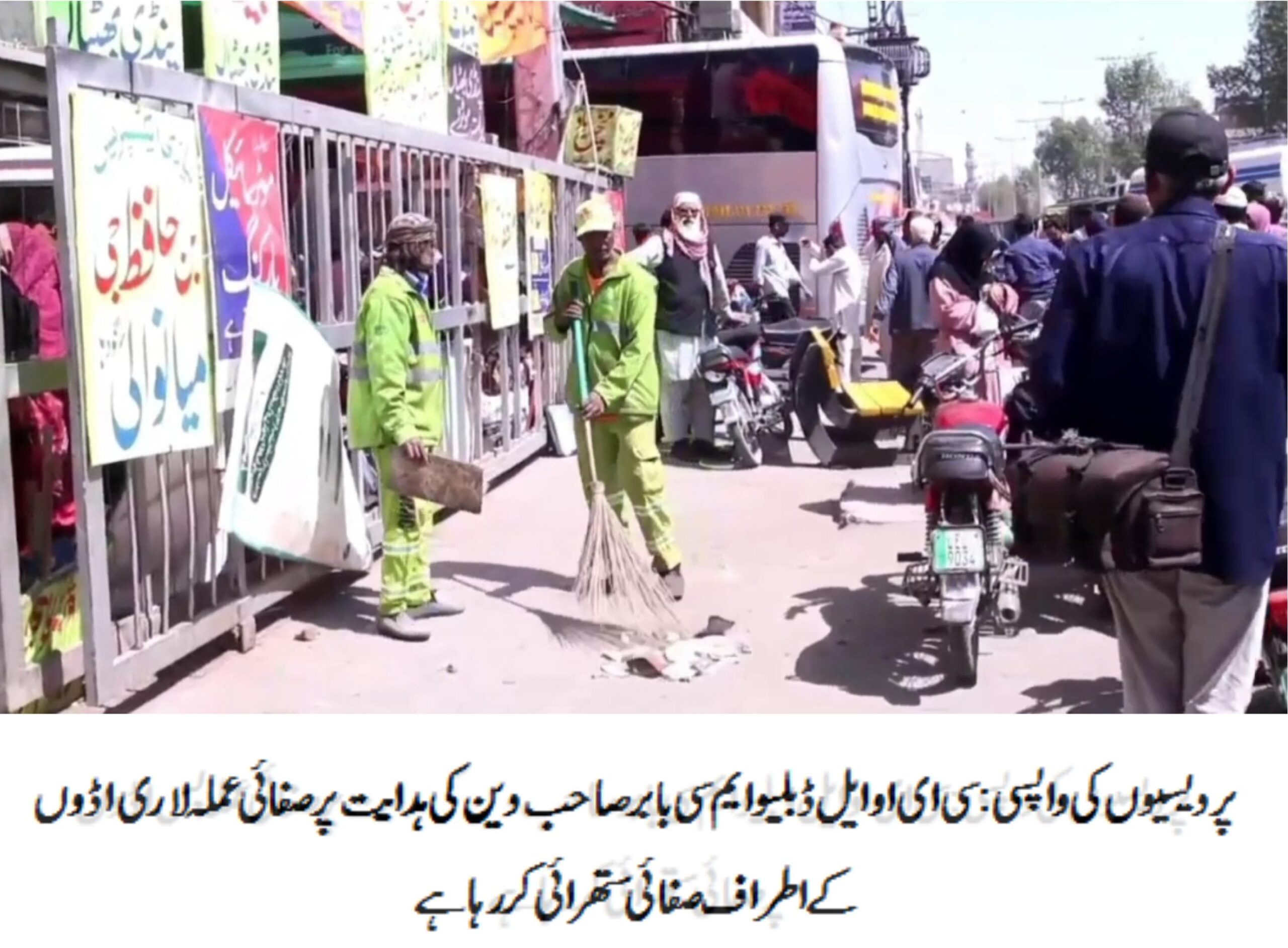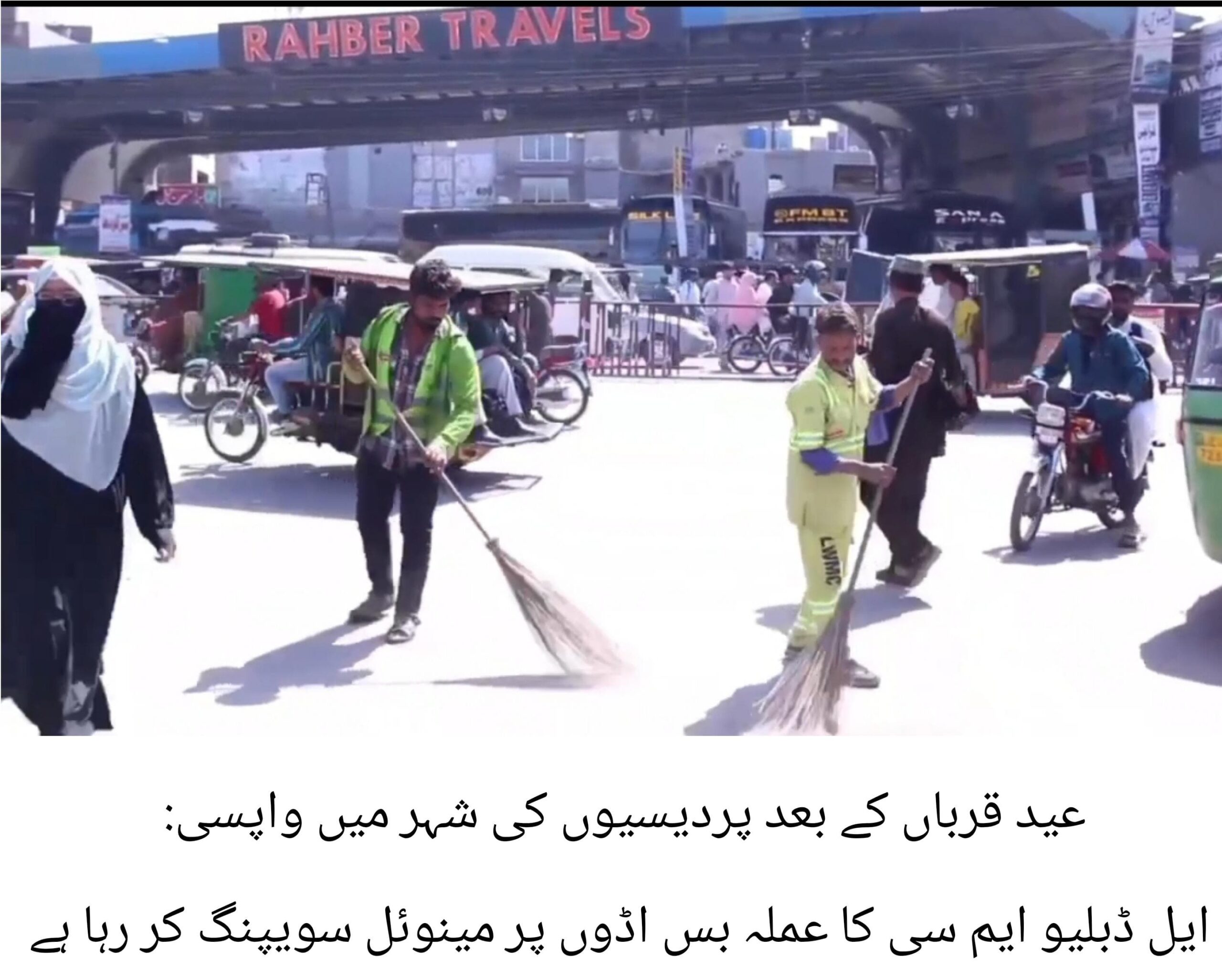 چیف ایگزیکٹیو آفیسر لاہور ویسٹ مینجمنٹ کمپنی بابر صاحب دین کی ہدایت پر شہربھر میں صفائی آپریشن بلا تعطل جاری ہے۔عید منا کر واپس آنے والے پردیسیوں کی آمد کے پیشِ نظربس اسٹینڈ، لاری اڈوں اور عوامی رش کے مقامات پرخصوصی صفائی اقدامات کے لیے اضافی عملہ تعینات کیا گیا۔