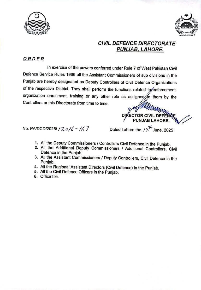پنجاب بھر میں تمام اسسٹنٹ کمشنرز کو سول ڈیفنس آرگنائزیشن کا __ڈپٹی کنٹرولر بنا دیا گیا ۔سول ڈیفنس آرگنائزیشن کی انفورسمنٹ ،انرولمنٹ اور ٹریننگ بذریعہ اسسٹسنٹ کمشنرز/ڈپٹی کنٹرولر ہوگی ۔اس سلسلہ میں ڈائریکٹر سول ڈیفنس کی جانب سے نوٹیفکیشن جاری کر دیا گیا ہے۔