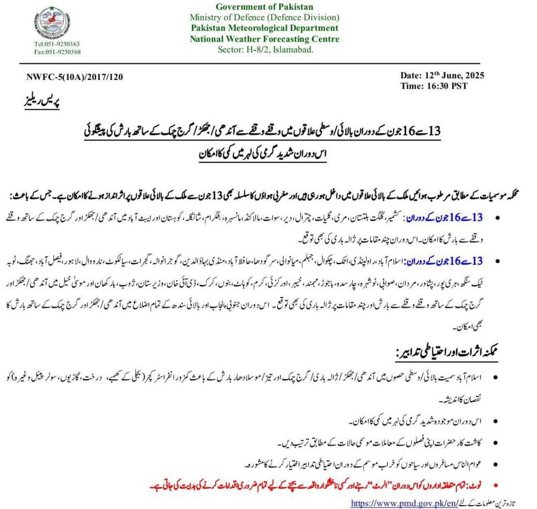 ڈپٹی کمشنر/چیئرمین ڈیزاسٹر مینجمنٹ اتھارٹی (DDMA) گلگت، امیر اعظم حمزہ، کی جانب سے ضلع گلگت کے تمام عوام الناس کو مطلع کیا جاتا ہے کہ محکمہ موسمیات کی پیشگوئی کے مطابق 13 جون سے 16 جون 2025 تک گلگت بلتستان کے مختلف علاقوں میں آندھی، گرج چمک کے ساتھ وقفے وقفے سے بارش اور بعض مقامات پر ژالہ باری کا امکان ہے۔