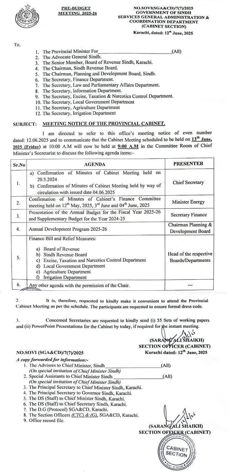 وزیر اعلیٰ سندھ سید مراد علی شاہ نے سندھ کابینہ کا اجلاس 13 جون کو طلب کر لیا ہے۔