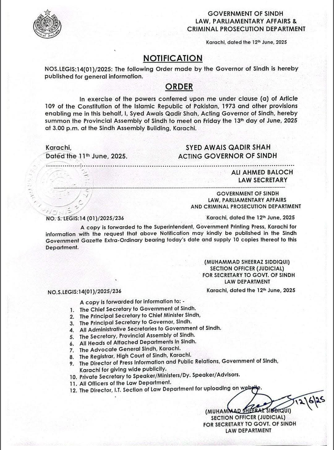 قائم مقام گورنرسندھ اویس قادر شاہ نے سندھ اسمبلی کا اجلاس کل بروز جمعہ سہ پہر 3 بجے طلب کر لیا ہے۔ اجلاس میں سندھ کا مالی سال 26-2025 کا بجٹ پیش کیا جائے گا۔
