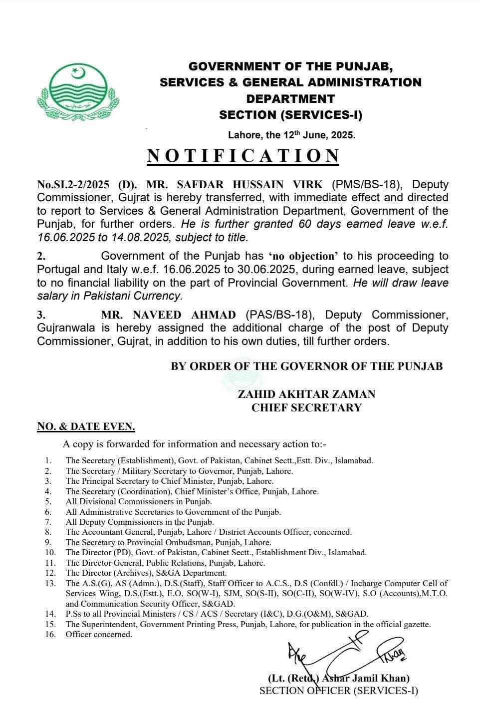 ، حکومت پنجاب کا نوٹیفیکشن جاری،نوید احمد ڈپٹی کمشنر گوجرانوالہ کو ضلع گجرات کا بطور ڈپٹی کمشنر گجرات ایڈیشنل چارج دے دیا گیا۔پنجاب حکومت نے ڈپٹی کمشنر گجرات صفدر ورک کی دو ہفتے چھٹی کی درخواست بھی قبول کر لی۔صفدر ورک 16 سے 30 جُون پُرتگال اور اِٹلی جائیں گے۔