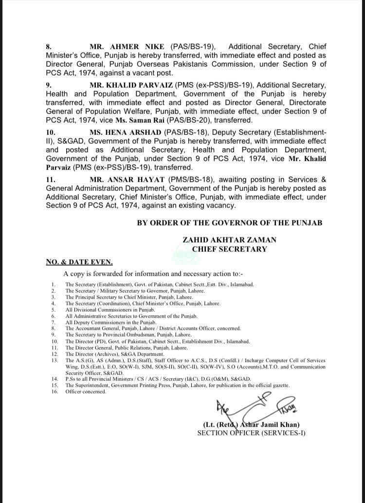 پنجاب بیوروکریسی میں تقرروتبادلے کے احکامات جاری کئے گئے ہیں۔سیکرٹری لائیو سٹاک ثاقب علی کو ممبر وزیراعلٰی انسپکشن ٹیم تعینات کردیا گیا ہے۔احمد عزیز تارڑ کو سیکرٹری محکمہ لائیو اسٹاک تعینات کردیا گیا ہے۔کیپٹن ریٹائرڈ اسد اللہ کو سیکرٹری محکمہ پراسیکیوشن تعینات کردیا گیا ہے۔وقار عظیم کو سپیشل سیکرٹری محکمہ ہاوسنگ تعینات کردیا گیا ہے۔ احمر نائیک کو ڈائریکٹر جنرل پنجاب اوورسیز پاکستانیز کمیشن تعینات کردیا گیا ہے۔انصر حیات کو ایڈیشنل سیکرٹری وزیراعلٰی سیکرٹریٹ تعینات کردیا گیا ہے۔ثمن رائے کو کمشنر پنجاب اوورسیز پاکستانیز کمیشن تعینات کردیا گیا ہے۔منصور احمد راجہ کو ڈائریکٹر جنرل پی ایچ اے لاہور تعینات کردیا گیا ہے۔