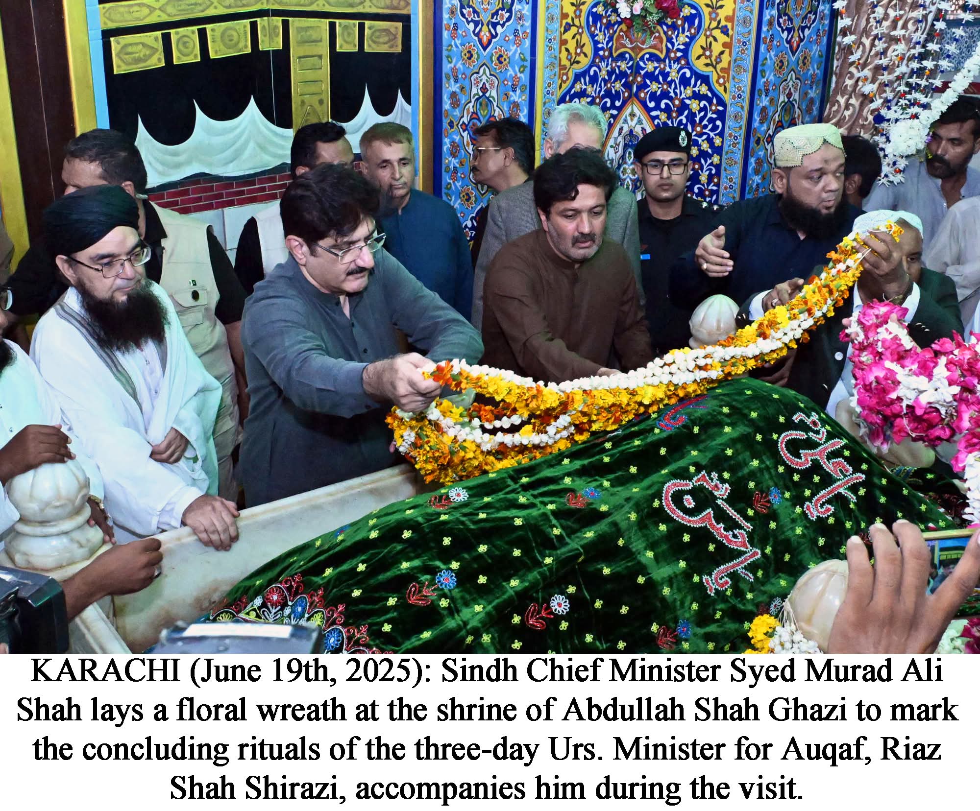 مراد علی شاہ نے ملک کی سلامتی، ترقی اور خوشحالی کے لیے دعا کی اور عوام سے اپیل کی کہ وہ صوفی بزرگوں کے بتائے ہوئے راستے پر چلیں۔ انہوں نے آج کے دور میں اتحاد اور برداشت کی اہمیت کو اجاگر کرتے ہوئے کہا کہ یہ اقدار عبداللہ شاہ غازی اور سندھ کے دیگر روحانی بزرگوں کی لازوال میراث ہیں۔عرس حضرت عبداللہ شاہ غازی کے وصال کی 1295ویں برسی کے طور پر منایا جا رہا ہے۔ آپ نہ صرف اسلام کے ایک بہادر سپاہی اور مبلغ تھے بلکہ امام حسن رضی اللہ عنہ کی نسل سے بھی تھے۔ اس روحانی موقع پر ہزاروں عقیدت مندوں نے ملک بھر سے شرکت کی جو سندھ کے ثقافتی کیلنڈر کا ایک اہم حصہ بن چکا ہے۔مراد شاہ نے کہا کہ اپوزیشن کا کام تنقید کرنا ہے اور میں اسے کبھی ذاتی نہیں لیتا۔ تاہم تنقید کو بدتمیزی یا غیر مہذب رویے کا بہانہ نہیں بنانا چاہیے۔ ہمیں ہمیشہ باہمی احترام کو برقرار رکھنا چاہیے۔انہوں نے مزید کہا کہ اپوزیشن کو بھی سندھ کے صوفیوں کا خیال رکھنا چاہیے کیونکہ وہ ہماری ثقافت اور روایات کی نمائندگی کرتے ہیں۔ ان کی تعلیمات ہمارے درمیان بھائی چارے اور محبت کو فروغ دیتی ہیں۔ایک سوال کے جواب میں مراد شاہ نے کہا کہ اللہ کے فضل سے وہ طویل عرصے سے وزیر اعلیٰ کے طور پر خدمات انجام دے رہے ہیں اور سندھ کی ترقی کے لیے محنت کی ہے۔بھارت کی جارحیت سے متعلق سوال پر وزیر اعلیٰ نے کہا کہ بھارت نے پاکستان پر بلا اشتعال حملہ کیا لیکن چند دنوں میں ہی بھارت کو اس کے نتائج کا اندازہ ہو گیا۔ جب پوری قوم اپنی مسلح افواج کے پیچھے کھڑی ہو تو ظالموں کو بالآخر اپنے انجام کا سامنا کرنا پڑتا ہے۔ انہوں نے مزید کہا کہ جب ہر شخص اپنا کردار ادا کرتا ہے تو کامیابی یقینی ہوتی ہے۔ یہی جذبہ ہمیں اپنے ملک کے دفاع میں رہنمائی فراہم کرتا ہے۔مراد شاہ نے کہا کہ چیئرمین بلاول بھٹو نے بین الاقوامی میڈیا میں مؤثر انداز میں پاکستان کا مؤقف پیش کیا جس کے بعد حکومت نے انہیں سفارتی وفد کی قیادت کے لیے بھیجا۔ ان کا کہنا تھا کہ بلاول بھٹو زرداری کی سفارت کاری کی وجہ سے دنیا کا پاکستان کے بارے میں نقطہ نظر تبدیل ہوا ہے جو ہمارے لیے باعثِ فخر ہے۔ فیلڈ مارشل عاصم منیر اور امریکی صدر ڈونلڈ ٹرمپ کی ملاقات کے بارے میں گفتگو کرتے ہوئے مراد شاہ نے کہا کہ اس کے بھی مثبت نتائج سامنے آئے ہیں جن سے پاکستان کی خارجہ پالیسی کو تقویت ملی ہے۔وزیر اعلیٰ نے اعلان کیا کہ چیئرمین بلاول بھٹو زرداری کل کراچی پہنچیں گے اور ان کا شاندار استقبال کیا جائے گا۔ انہوں نے وطن سے محبت کرنے والے تمام پاکستانیوں سےاپیل کی کہ وہ ایئرپورٹ پر آکر ان کا استقبال کریں کیونکہ چیئرمین بلاول بھٹو کی وجہ سے دنیا میں پاکستان کا نقطہ نظر واقعی تبدیل ہوا ہے اور ہمیں ان پر فخر ہے۔یہ بیانات وزیراعلیٰ سندھ نے عبداللہ شاہ غازی کے مزار پر میڈیا سے گفتگو کے دوران دیے جن میں سندھ کی سیاسی صورتِ حال اور قومی دفاع سے متعلق اہم پیغامات شامل تھے۔