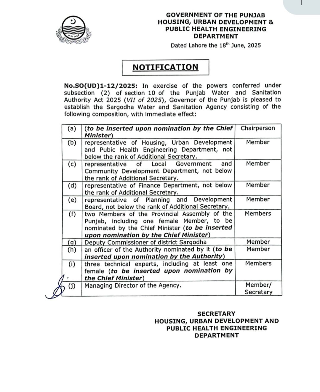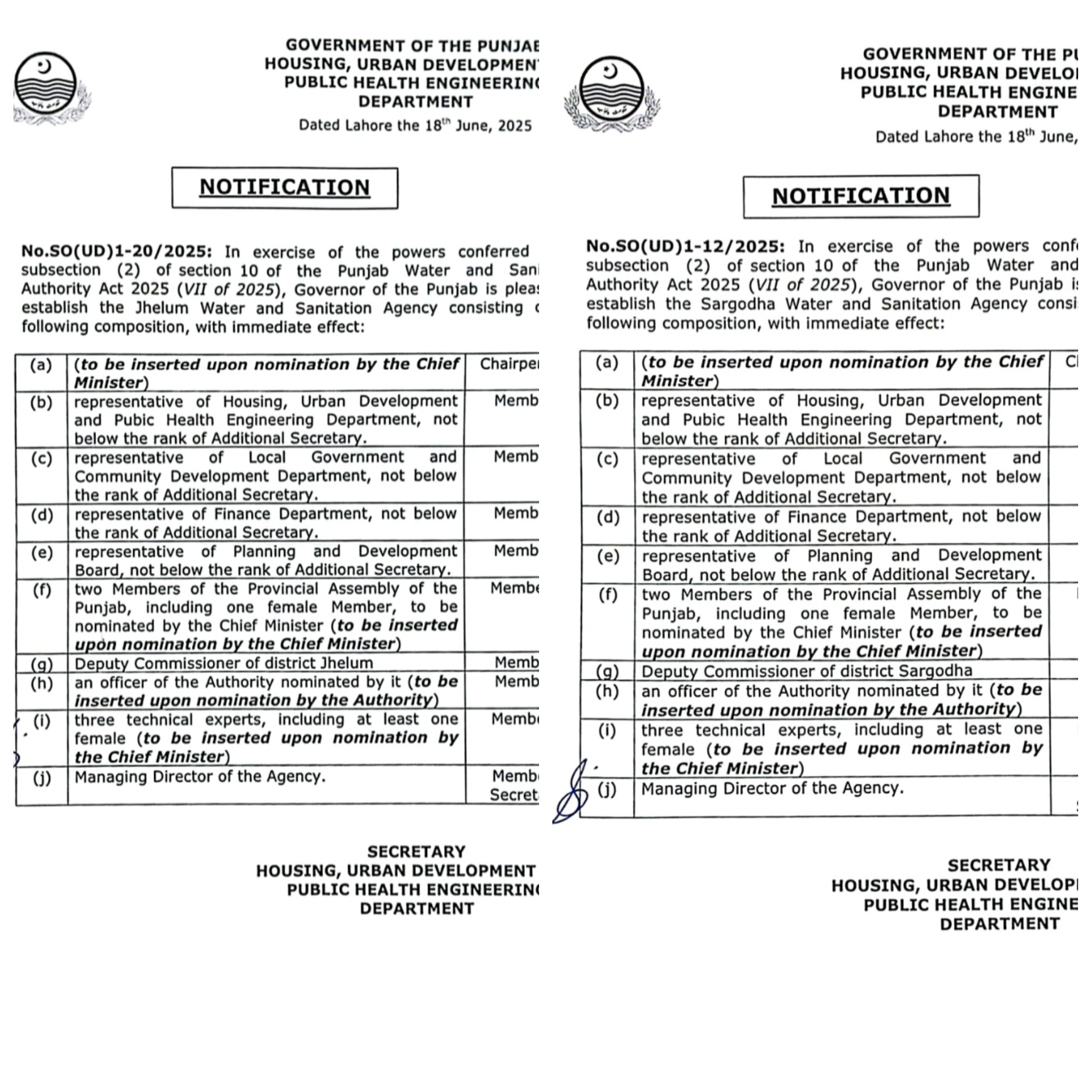 واٹر اینڈ سینیٹیشن ایجنسی سرگودھا اور جہلم کا نوٹیفکیشن جاری کردیا گیا ہے۔سیکرٹری ہاؤسنگ نور الامین مینگل کی جانب سے دونوں بڑے شہروں میں واسا کا قیام عمل میں لایا گیا ہے۔