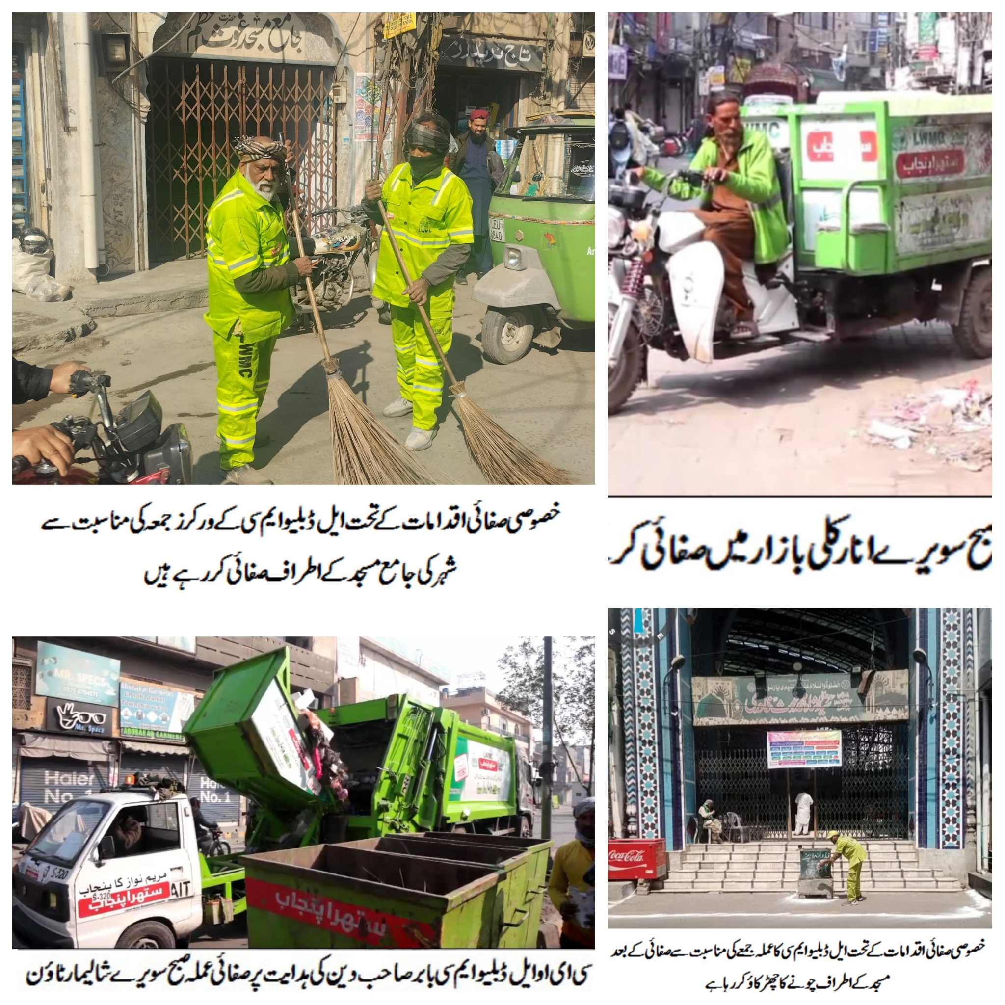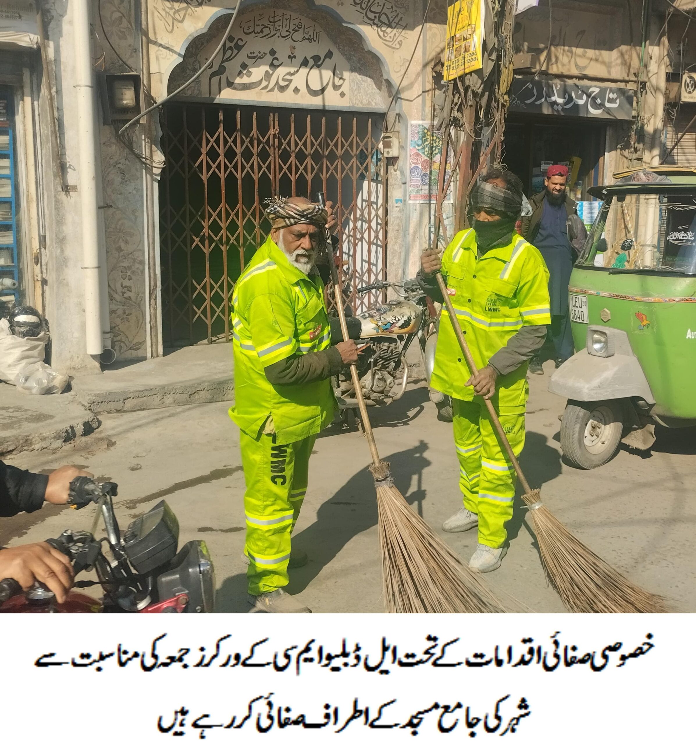 وزیر اعلیٰ پنجاب مریم نواز شریف کے ویژن ستھرا پنجاب پر عملدرآمد جاری ہے اس مقصد کے حصول کے لیے ایل ڈبلیو ایم سی آپریشن ٹیمیں صفائی کی بہترین سہولیات کی فراہمی ممکن بنانے کے لیے 24 گھنٹے فیلڈ میں متحرک ہیں۔سی ای او ایل ڈبلیو ایم سی کی ہدایت پر جمعہ کی مناسبت سے جامع مساجد کے گرد صفائی کے خصوصی انتظامات کیے گئے